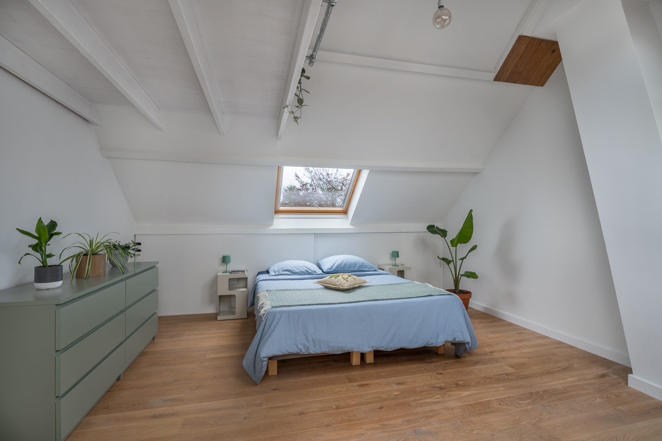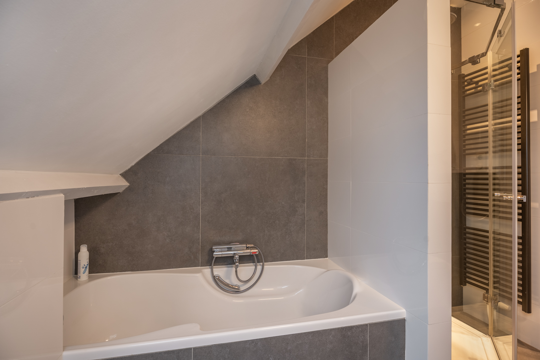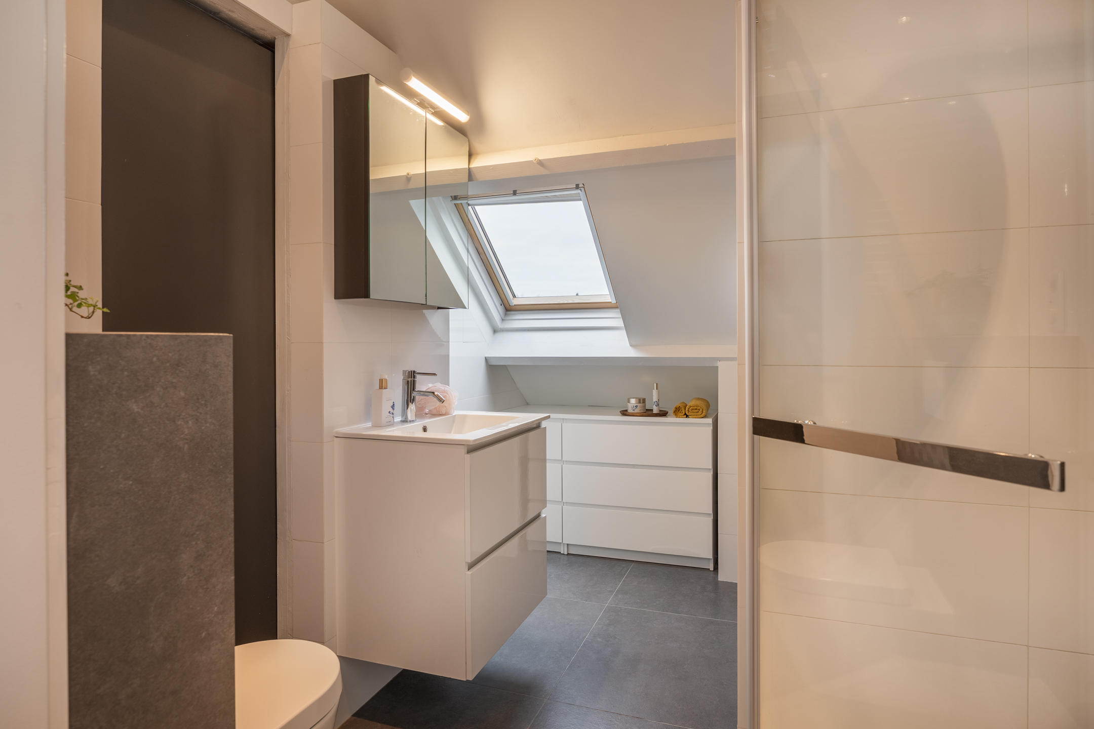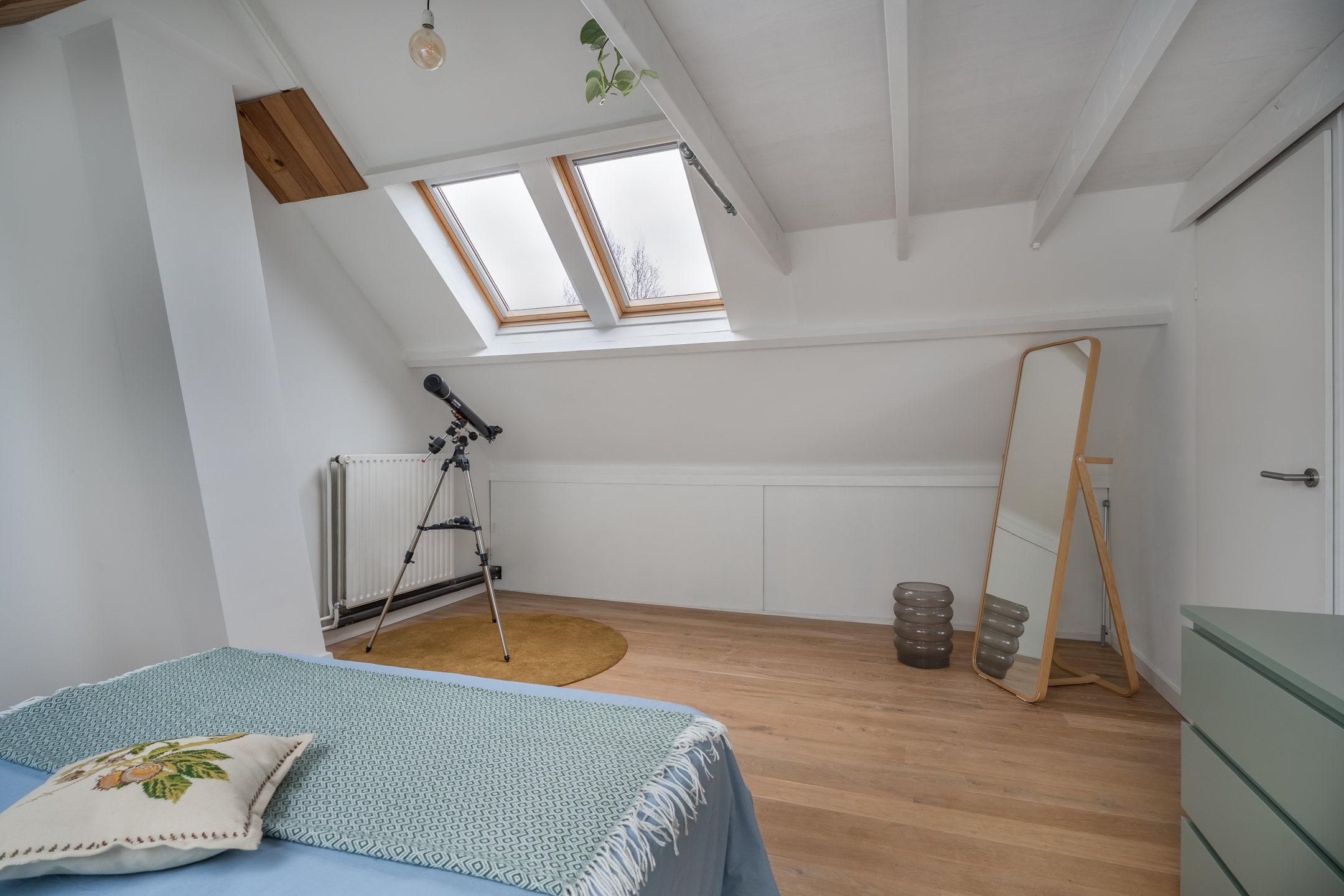 De tweede verdieping is volledig en ook hoogwaardig afgewerkt. Vanaf de voorzolder bereik je een slaapkamer en de tweede badkamer. Wat een prachtige, lichte ruimte is deze vierde slaapkamer! Dankzij de drie dakramen en de hoogte tot in de nok voelt het er bijzonder licht en ruimtelijk. Achter de knieschotten vind je handige bergruimte. Via een ladder is bovendien de bergzolder bereikbaar. De tweede badkamer is praktisch én speels ingedeeld. Je beschikt hier over een ligbad, regendouche, badmeubel met spiegelkasten en een toilet. De kasten onder de schuine wand zorgen voor extra opbergruimte en de cv-ketel is netjes geplaatst in een aparte ruimte die vanuit de badkamer toegankelijk is. Ook vind je hier een van de omvormers voor de zonnepanelen.