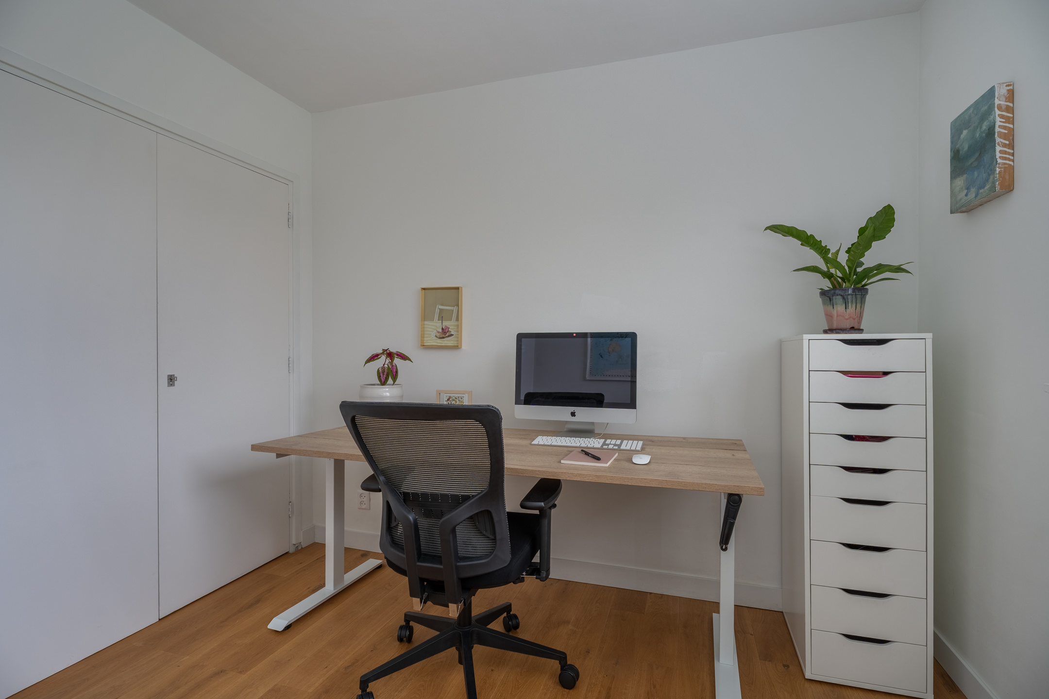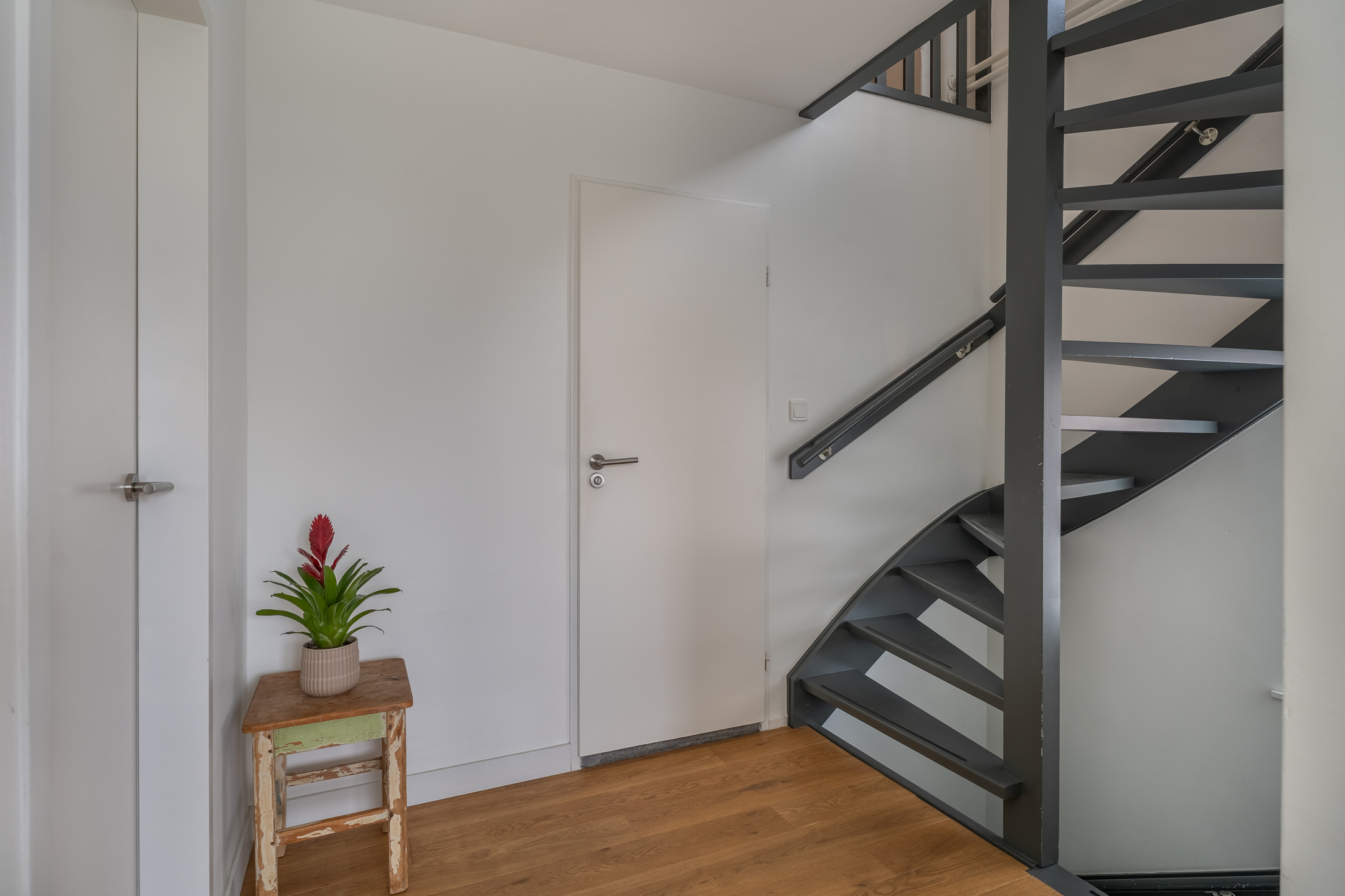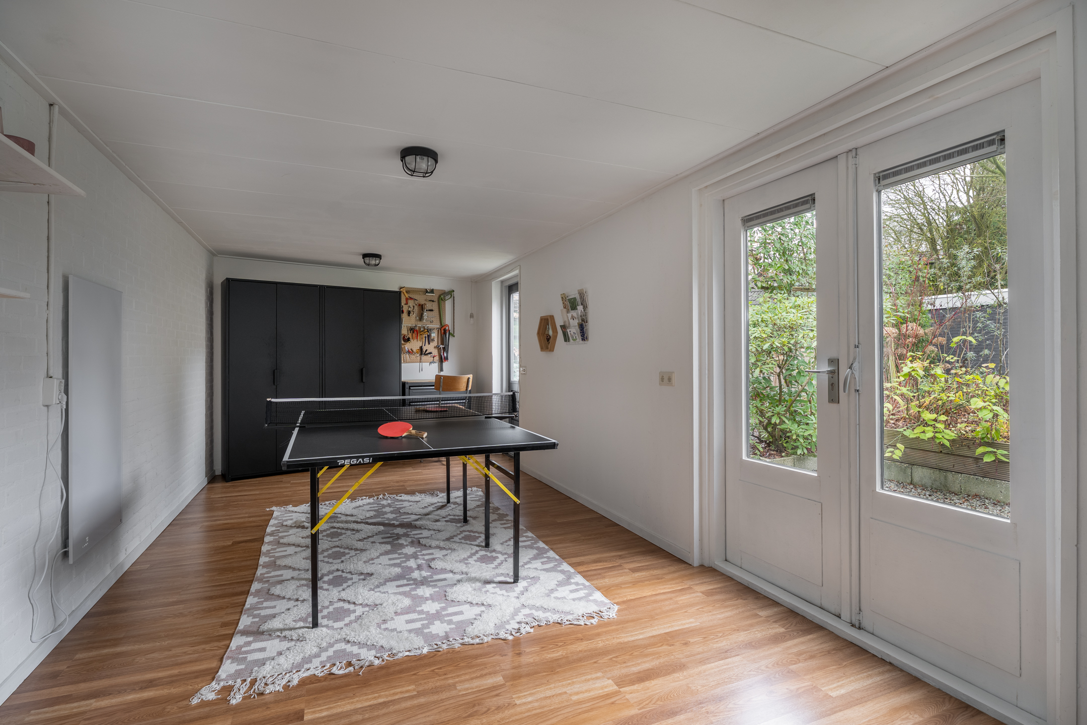 In de halfopen bijkeuken bevinden zich de aansluitingen voor de wasapparatuur, de achterdeur en de toegang tot de extra kamer. Deze ruimte is ideaal als werkkamer of, zoals eerder genoemd, als speelkamer. Worden de kinderen ouder, dan is dit een perfecte chill-ruimte. Ook hier is de afwerking keurig en via de openslaande deuren valt veel daglicht naar binnen. Daarnaast is in deze ruimte een van de omvormers van de zonnepanelen geplaatst.