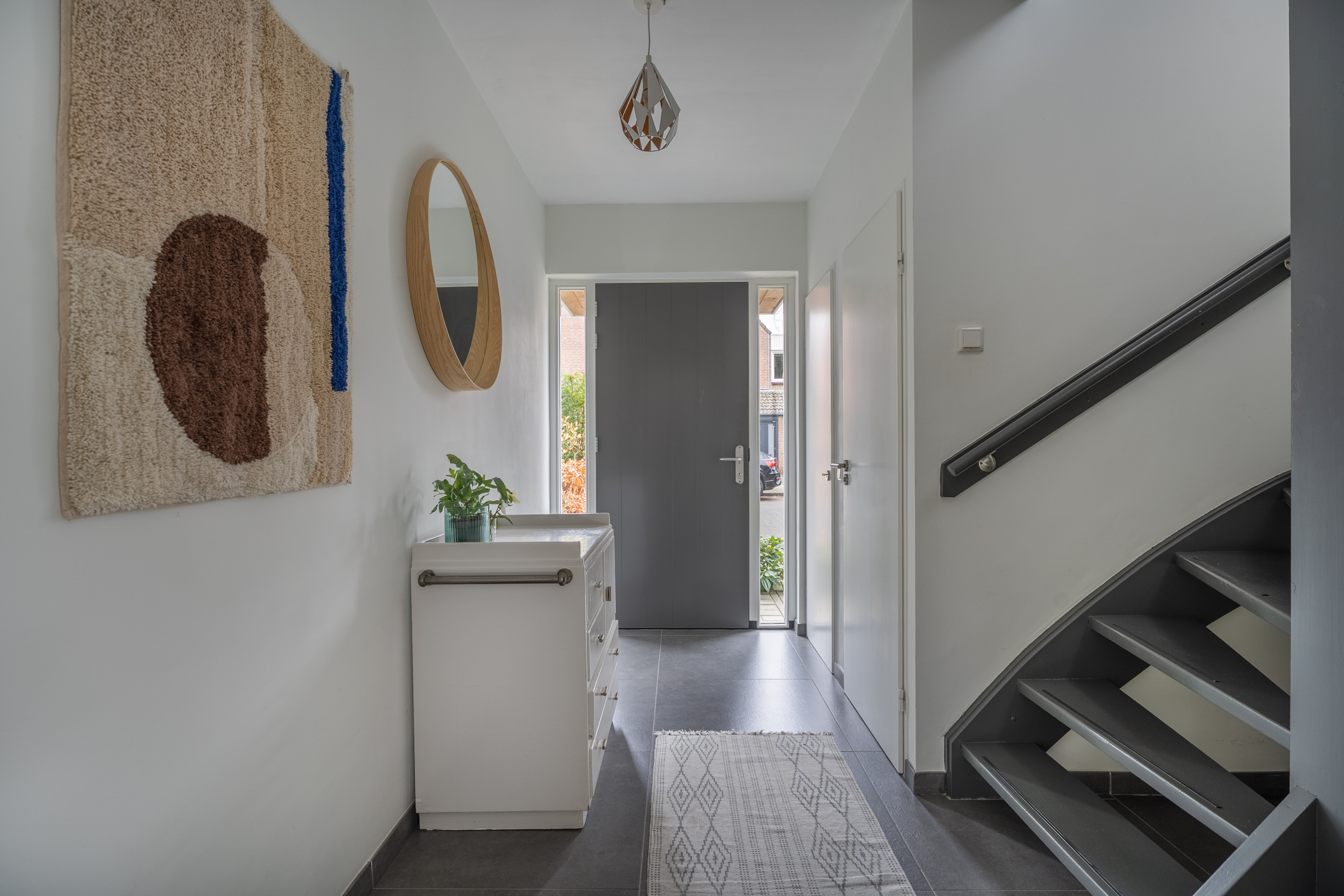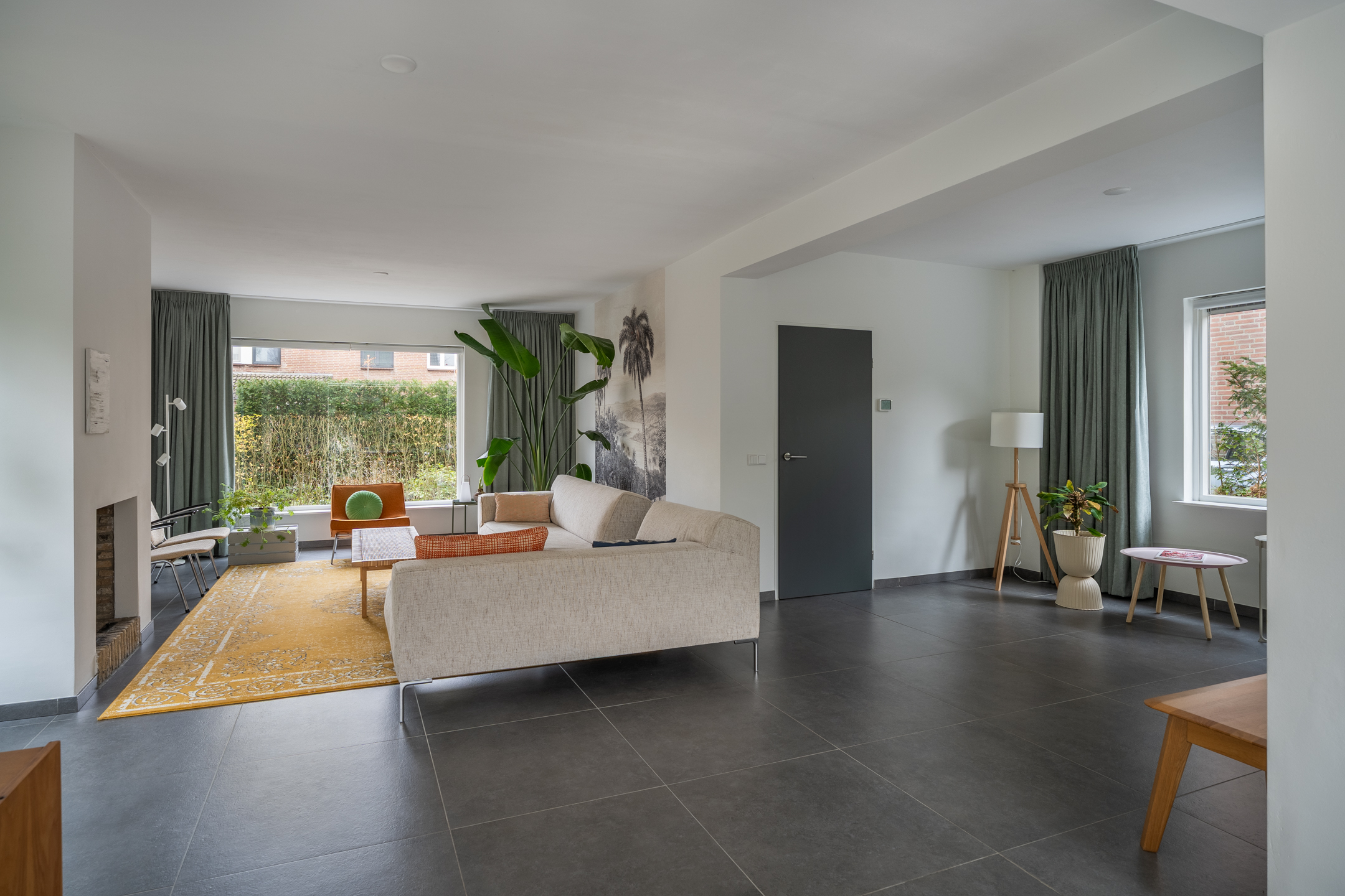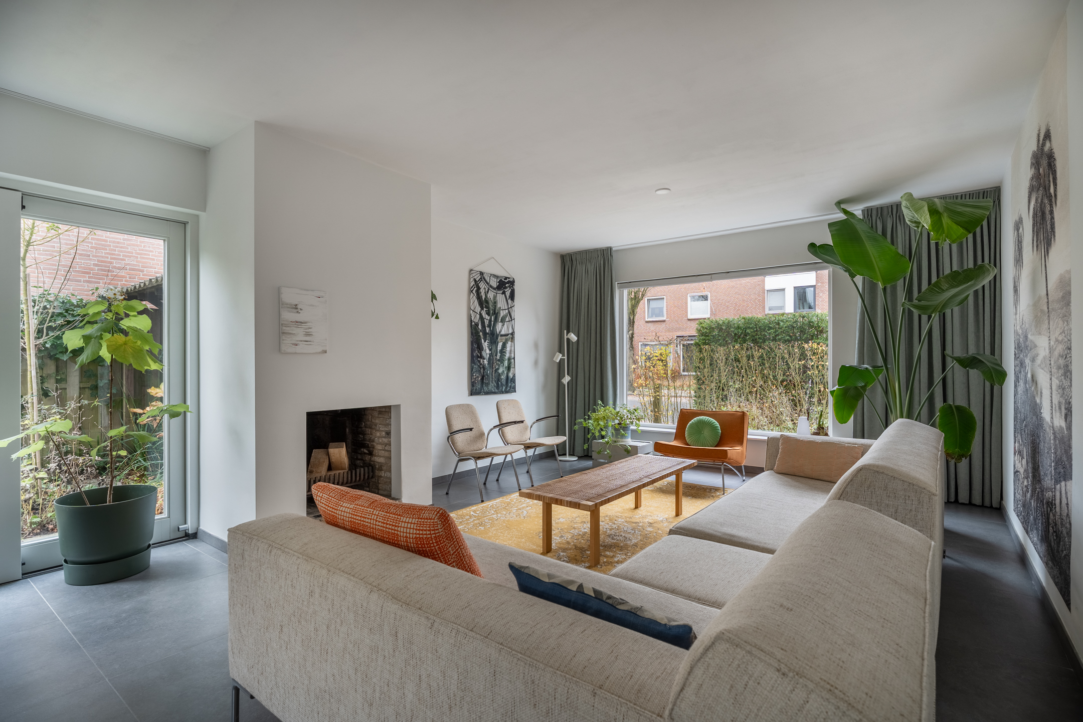 De woning is in 2018 volledig verbouwd, waardoor je direct bij binnenkomst de hoogwaardige afwerking ervaart: strak gestuukte wanden, sfeervol kleurgebruik en moderne, grote vloertegels met vloerverwarming. In de ruime hal vind je de meterkast, de toiletruimte en de trap naar de eerste verdieping. De woonkamer is aan drie zijden voorzien van grote raampartijen, waardoor er een zee van licht naar binnen valt. De zithoek aan de voorzijde heeft een prettige afmeting en de open haard zorgt, zeker in de koudere maanden, voor extra warmte en gezelligheid. In de zomer staat de schuifpui regelmatig open en loopt binnen moeiteloos over in buiten. Onder het zijraam kun je eenvoudig een fijne speelplek voor de kinderen creëren, al is daar nóg een geschikte kamer voor, waarover later meer.