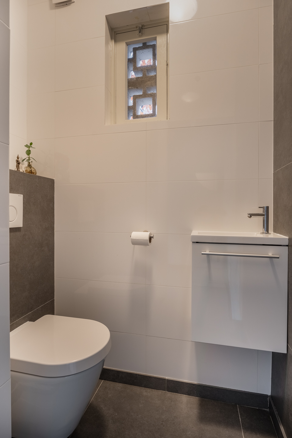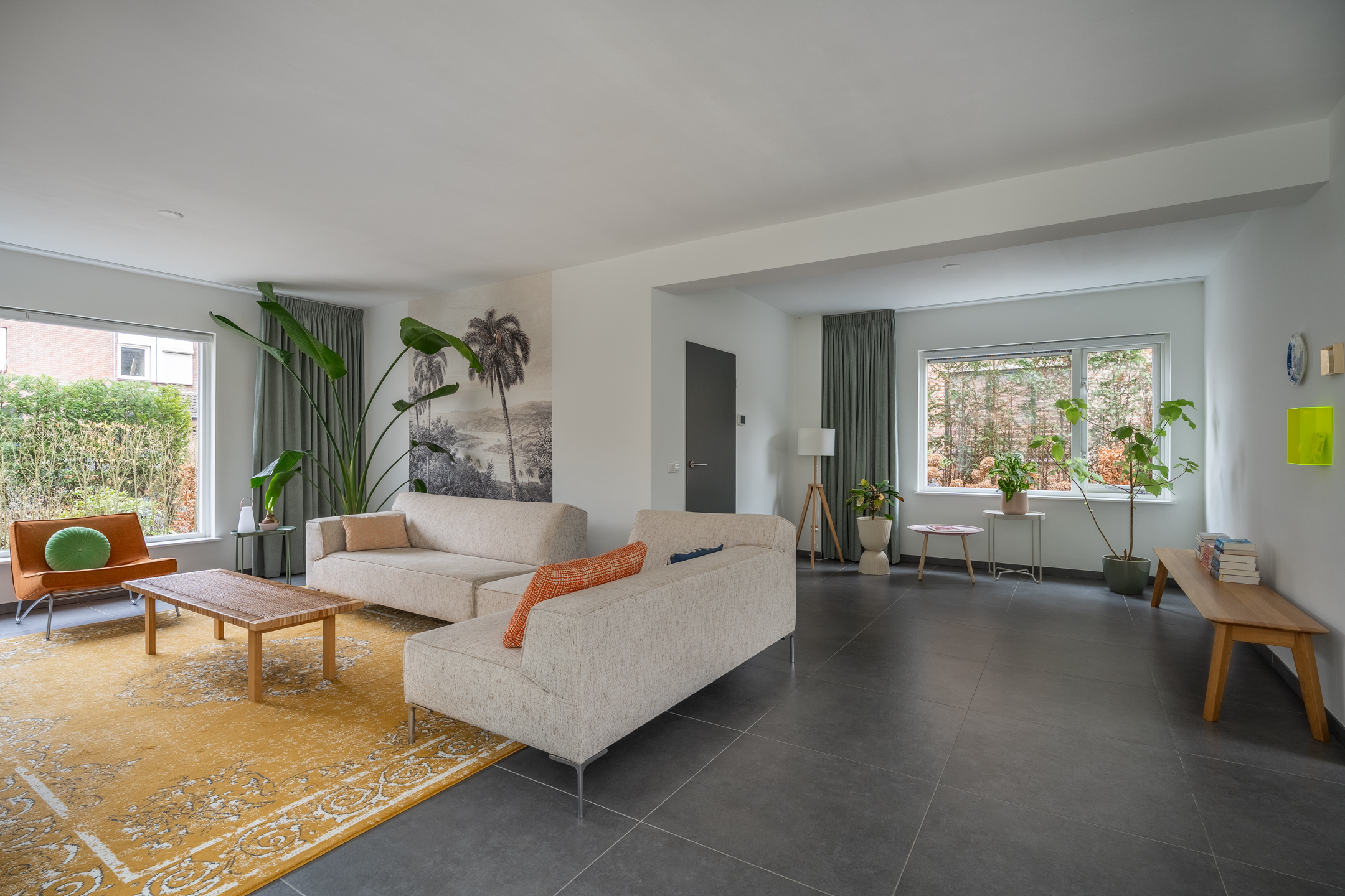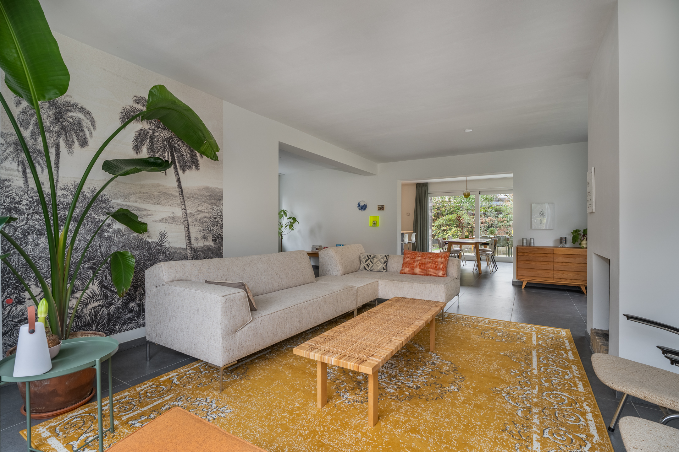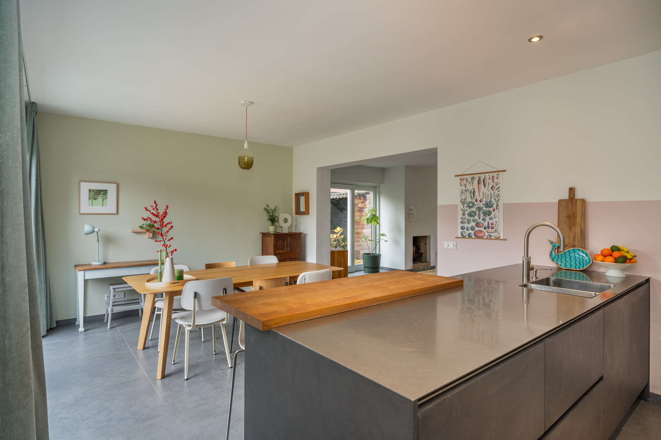 De woning is in 2018 volledig verbouwd, waardoor je direct bij binnenkomst de hoogwaardige afwerking ervaart: strak gestuukte wanden, sfeervol kleurgebruik en moderne, grote vloertegels met vloerverwarming. In de ruime hal vind je de meterkast, de toiletruimte en de trap naar de eerste verdieping. De woonkamer is aan drie zijden voorzien van grote raampartijen, waardoor er een zee van licht naar binnen valt. De zithoek aan de voorzijde heeft een prettige afmeting en de open haard zorgt, zeker in de koudere maanden, voor extra warmte en gezelligheid. In de zomer staat de schuifpui regelmatig open en loopt binnen moeiteloos over in buiten. Onder het zijraam kun je eenvoudig een fijne speelplek voor de kinderen creëren, al is daar nóg een geschikte kamer voor, waarover later meer.
