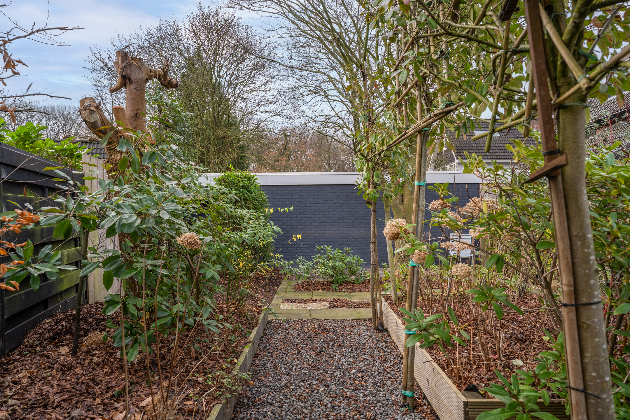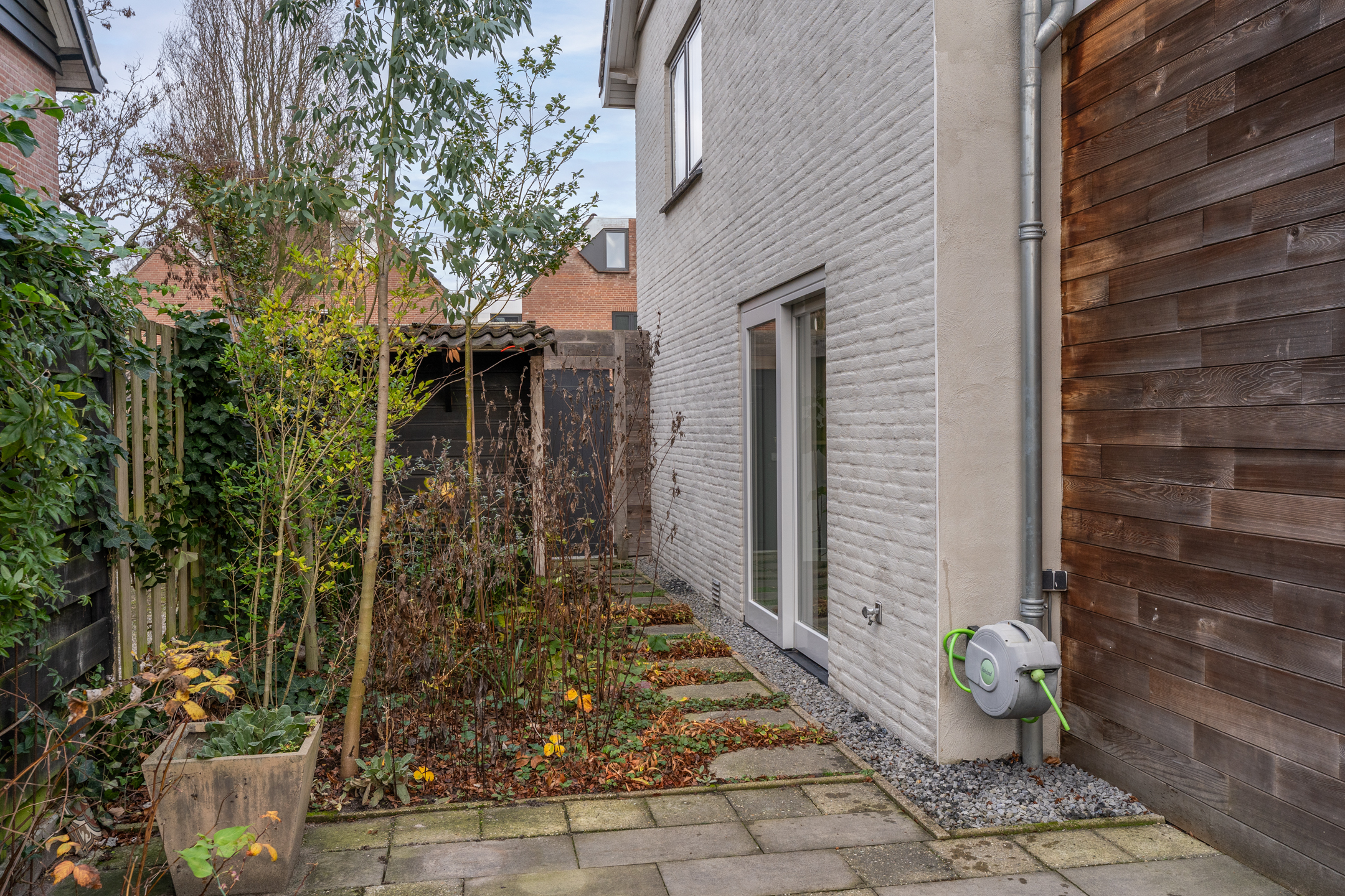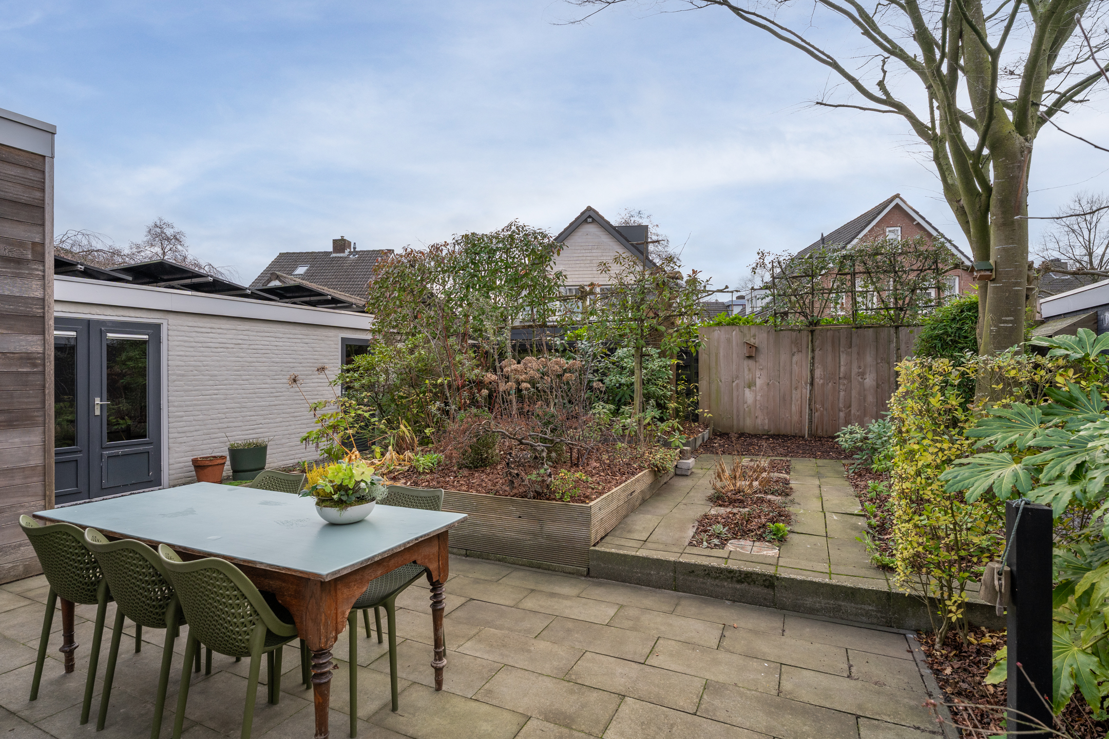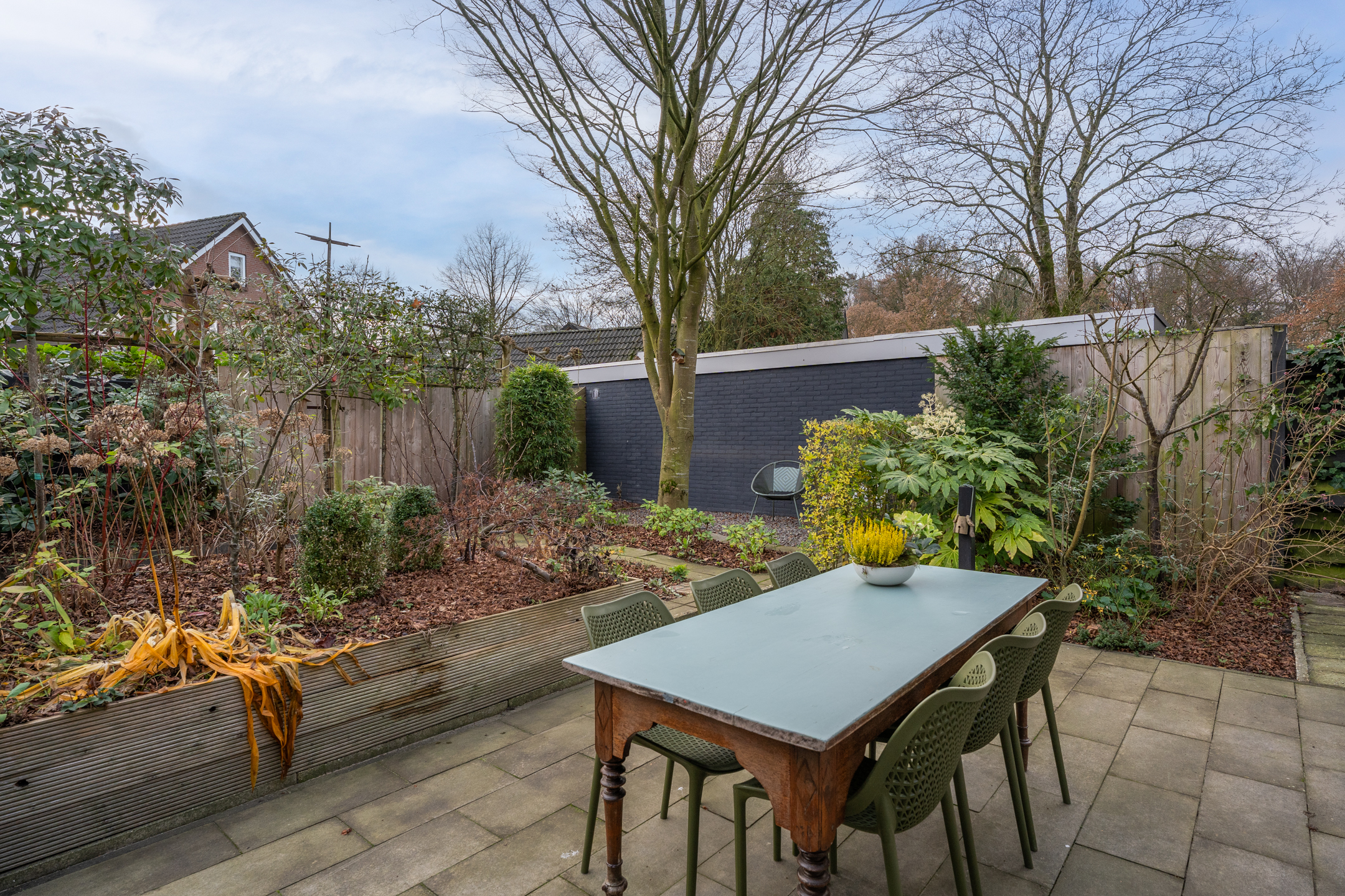 De volledig omheinde, volwassen tuin ligt op het zuidoosten. Dankzij de verschillende terrassen kun je op elk moment van de dag kiezen voor zon of schaduw. De bomen zorgen voor privacy en een groene sfeer, terwijl de verhoogde borders het onderhoud vergemakkelijken. Aan de voorzijde kun je zowel links als rechts op eigen terrein parkeren; met een kleine aanpassing is er zelfs ruimte voor drie auto’s. De achtertuin is via een poort vanaf de rechter oprit bereikbaar.
