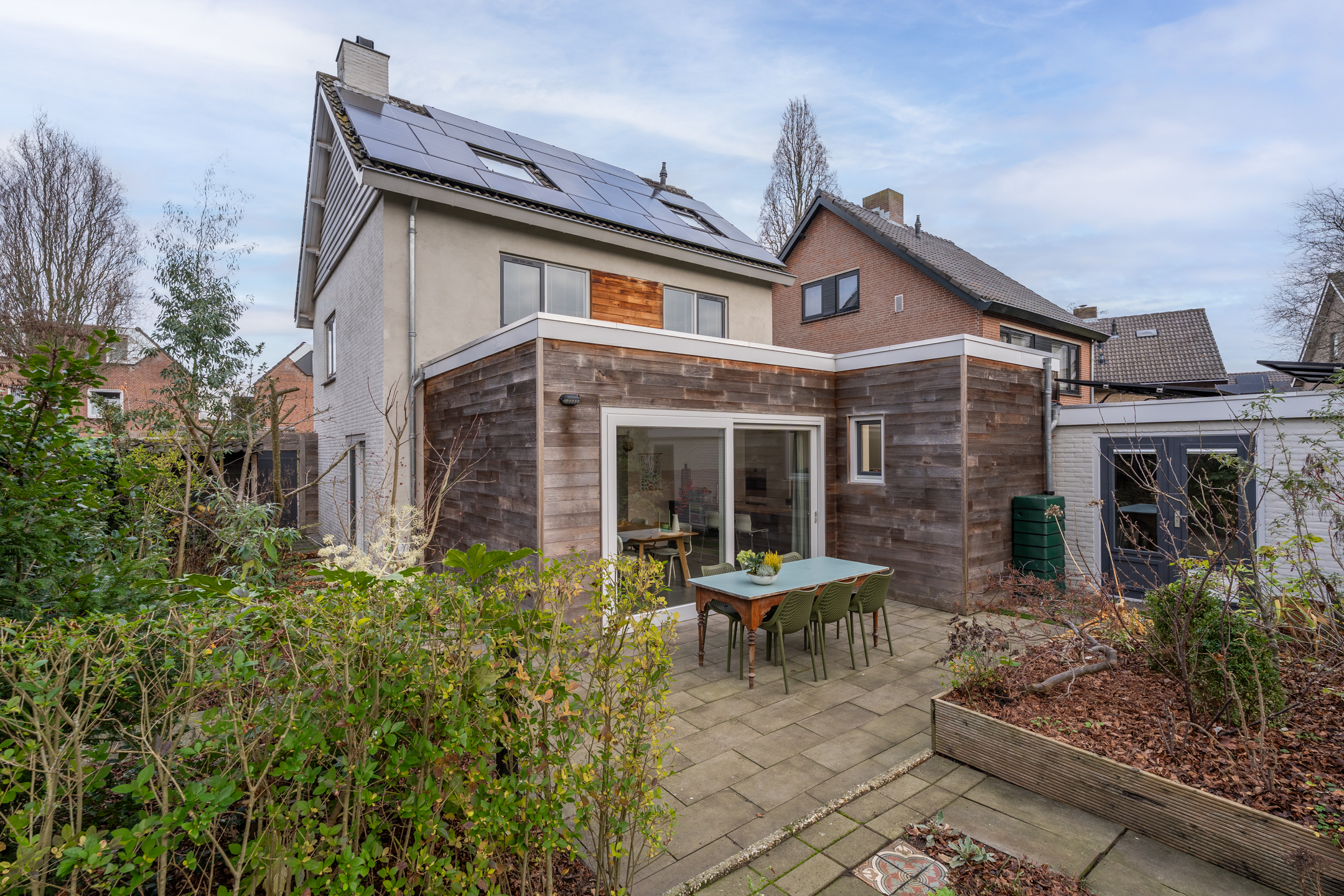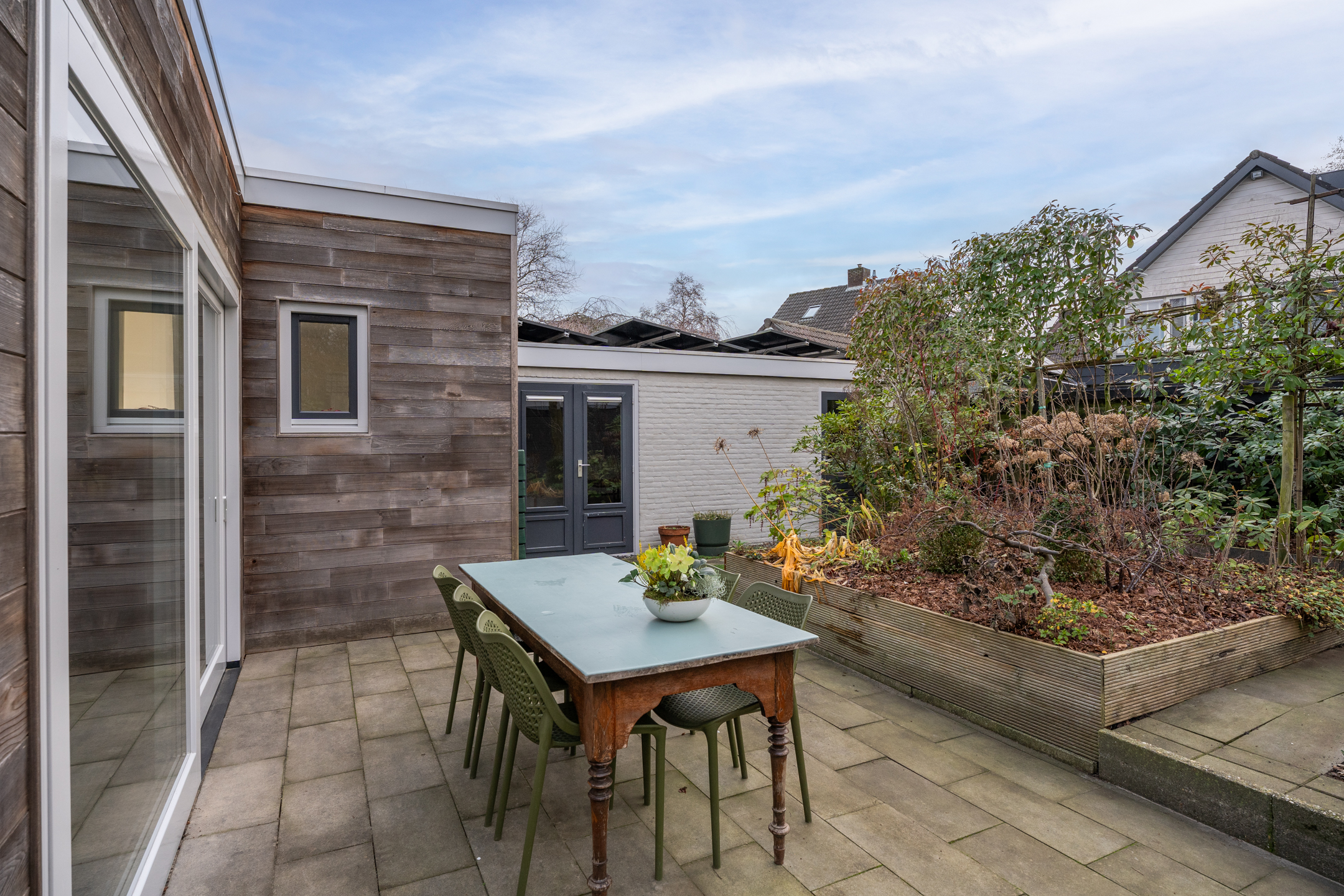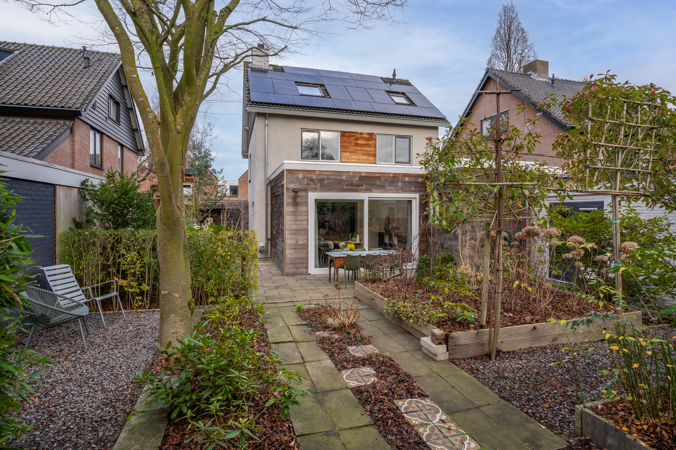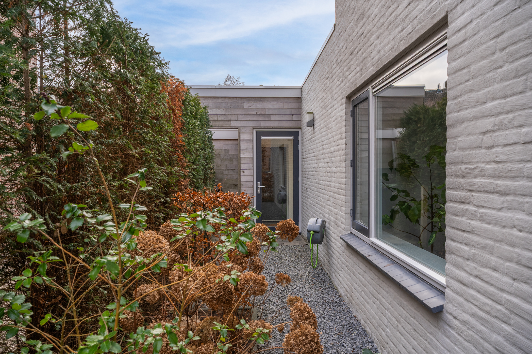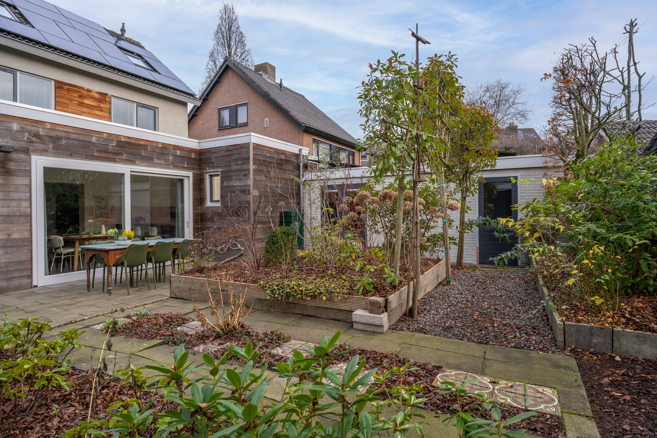 De volledig omheinde, volwassen tuin ligt op het zuidoosten. Dankzij de verschillende terrassen kun je op elk moment van de dag kiezen voor zon of schaduw. De bomen zorgen voor privacy en een groene sfeer, terwijl de verhoogde borders het onderhoud vergemakkelijken. Aan de voorzijde kun je zowel links als rechts op eigen terrein parkeren; met een kleine aanpassing is er zelfs ruimte voor drie auto’s. De achtertuin is via een poort vanaf de rechter oprit bereikbaar.