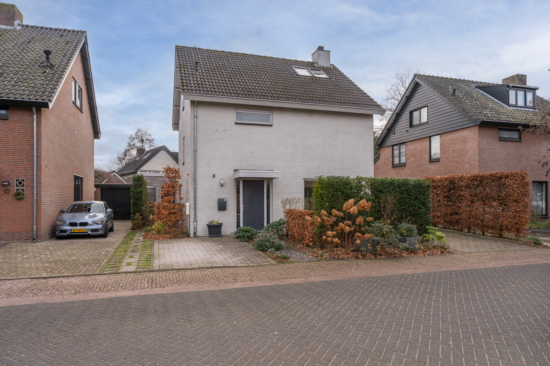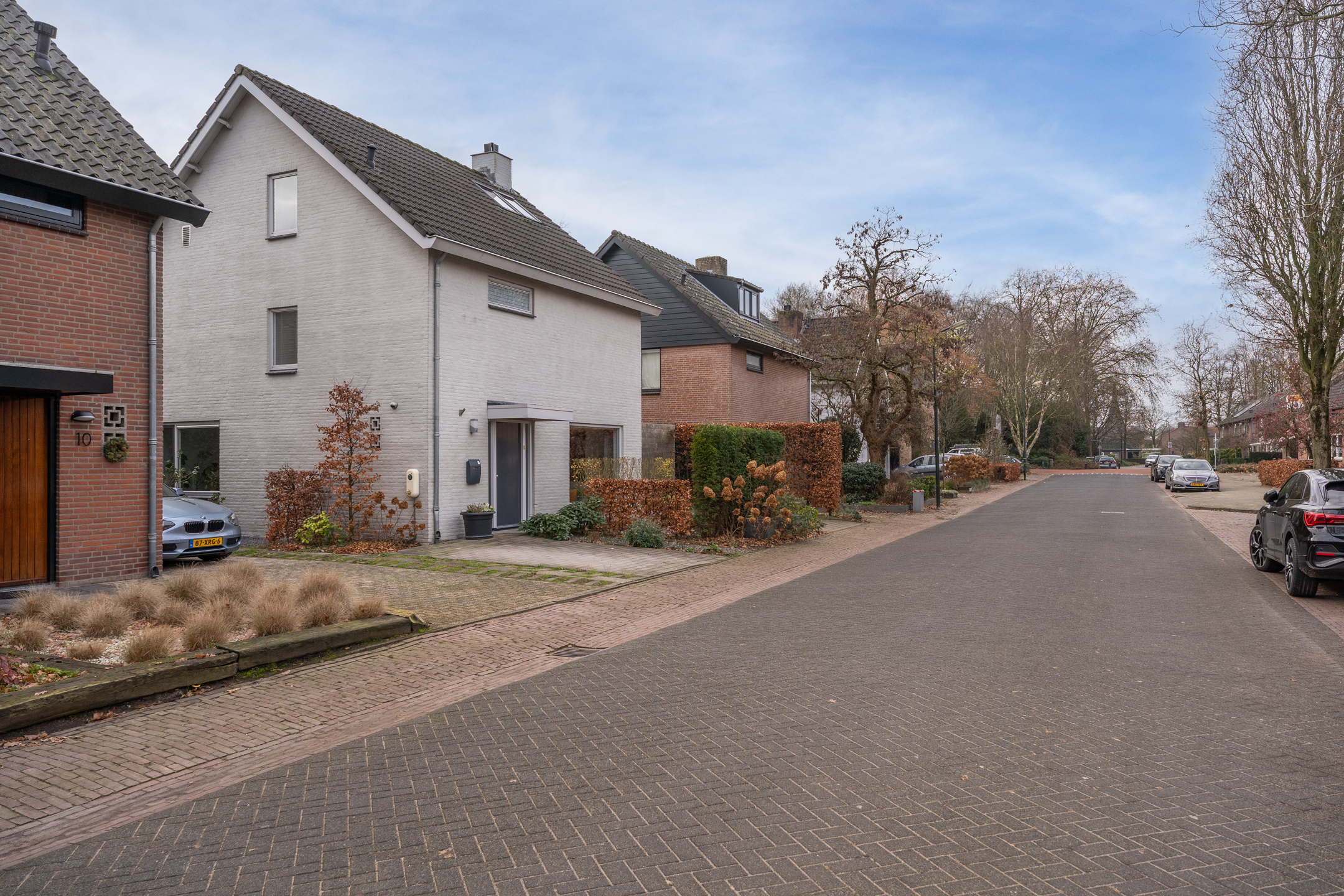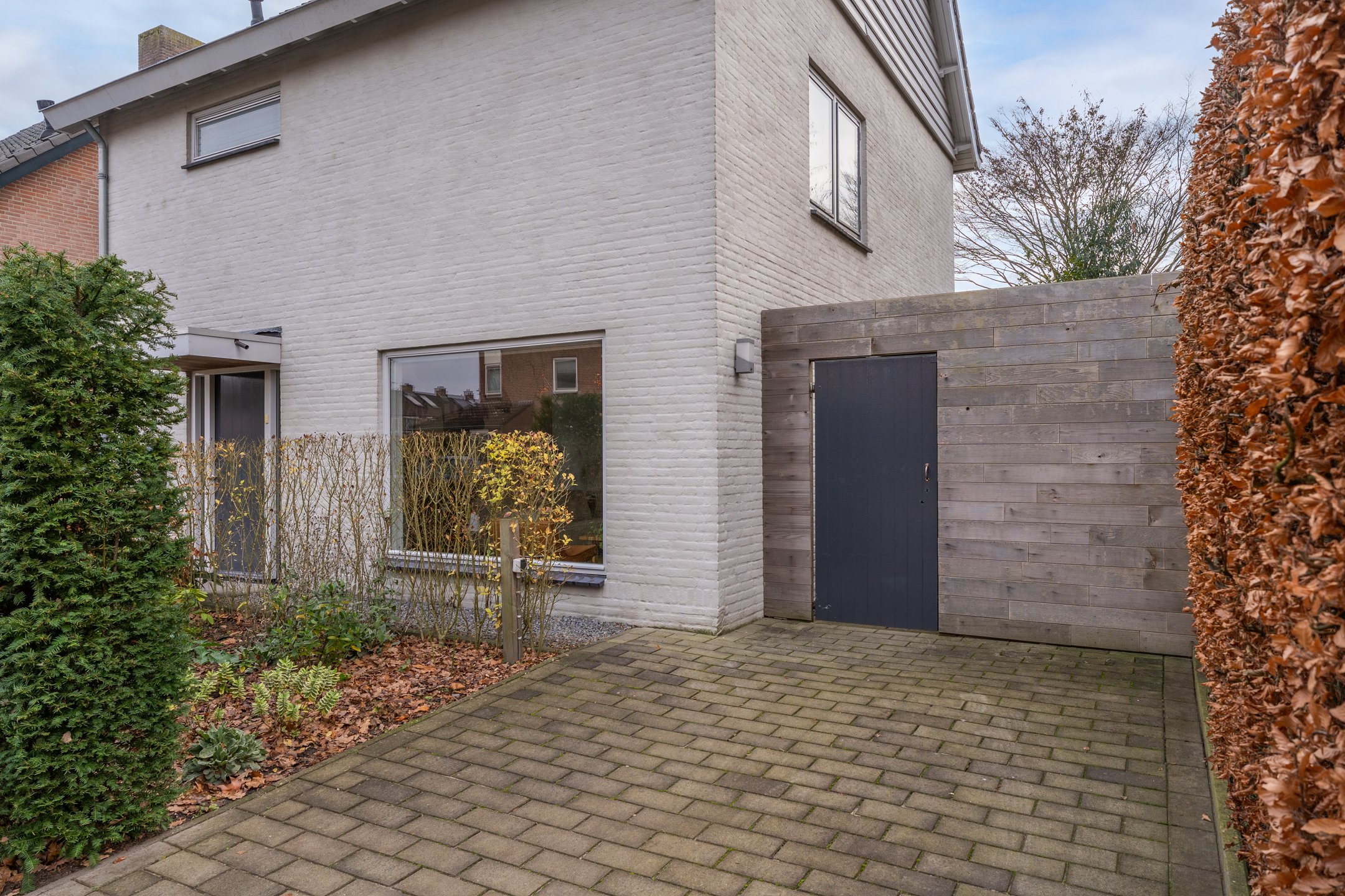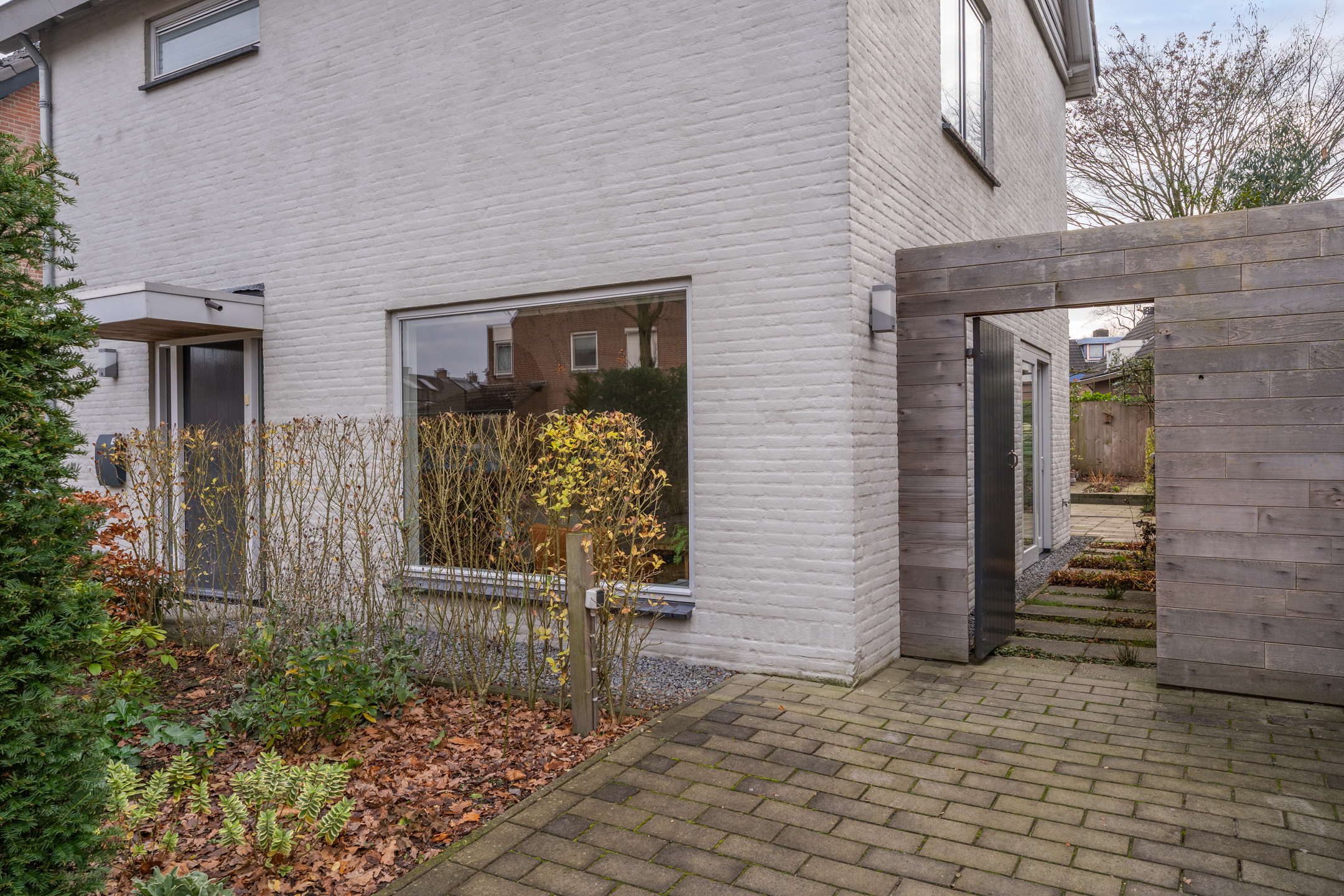 De volledig omheinde, volwassen tuin ligt op het zuidoosten. Dankzij de verschillende terrassen kun je op elk moment van de dag kiezen voor zon of schaduw. De bomen zorgen voor privacy en een groene sfeer, terwijl de verhoogde borders het onderhoud vergemakkelijken. Aan de voorzijde kun je zowel links als rechts op eigen terrein parkeren; met een kleine aanpassing is er zelfs ruimte voor drie auto’s. De achtertuin is via een poort vanaf de rechter oprit bereikbaar.