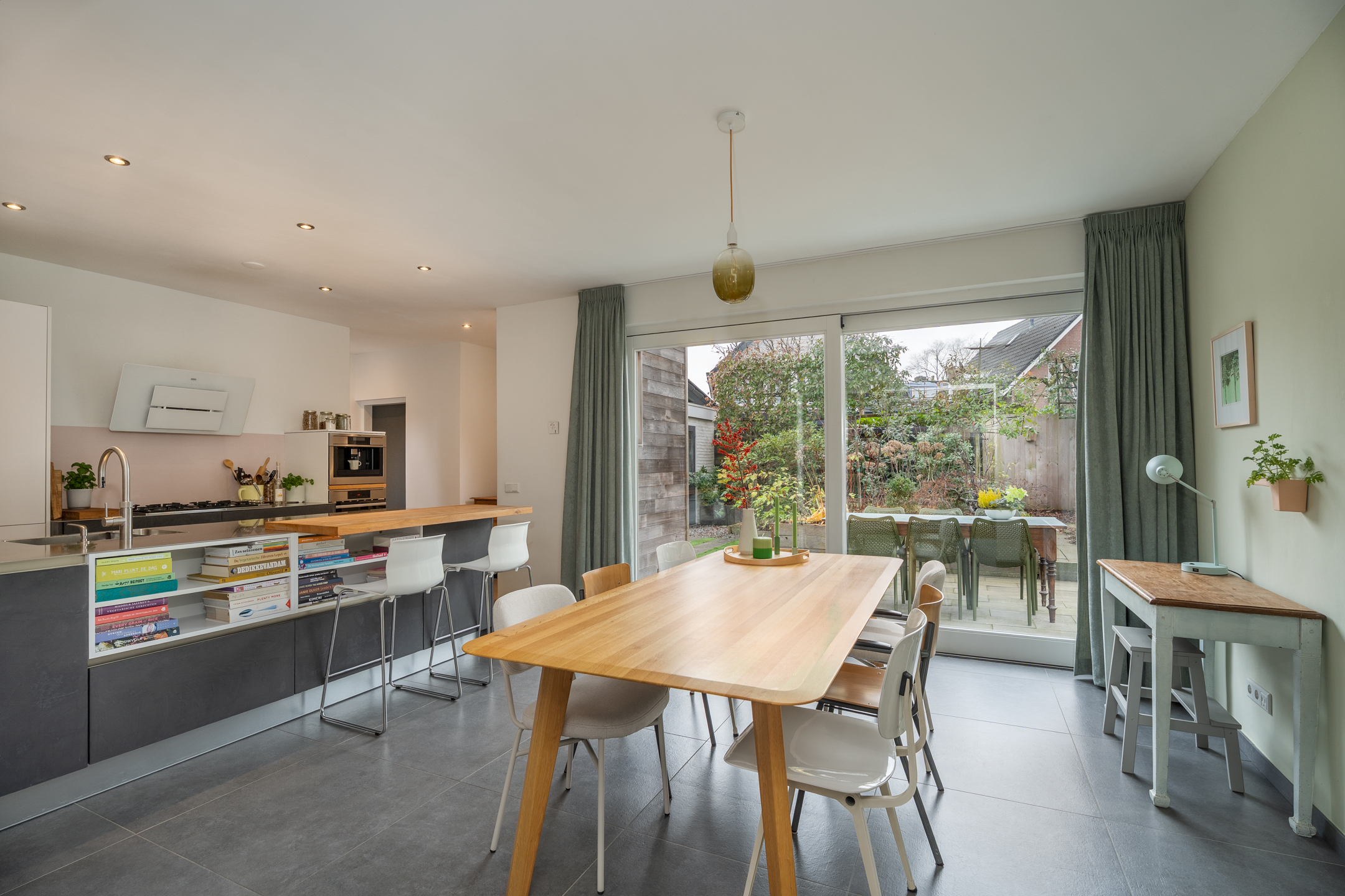 Aan de achterzijde is een royale leefkeuken gerealiseerd, die in open verbinding staat met de woonkamer. Wat een genot om hier samen urenlang te tafelen, er is plaats genoeg. Vanaf de eettafel kijk je uit over de tuin en met de schuifpui open stap je zo naar buiten. De moderne keuken nodigt uit om uitgebreid te koken en biedt ruimte voor meerdere koks. Je beschikt hier over een 5-pits gaskookplaat (met mogelijkheid voor inductie), afzuigkap, oven, combi-oven, koelkast, vaatwasser en Quooker. De ingebouwde koffiemachine zorgt voor een heerlijke start van de dag. Aan de bar kun je gezellig bijkletsen tijdens het koken.