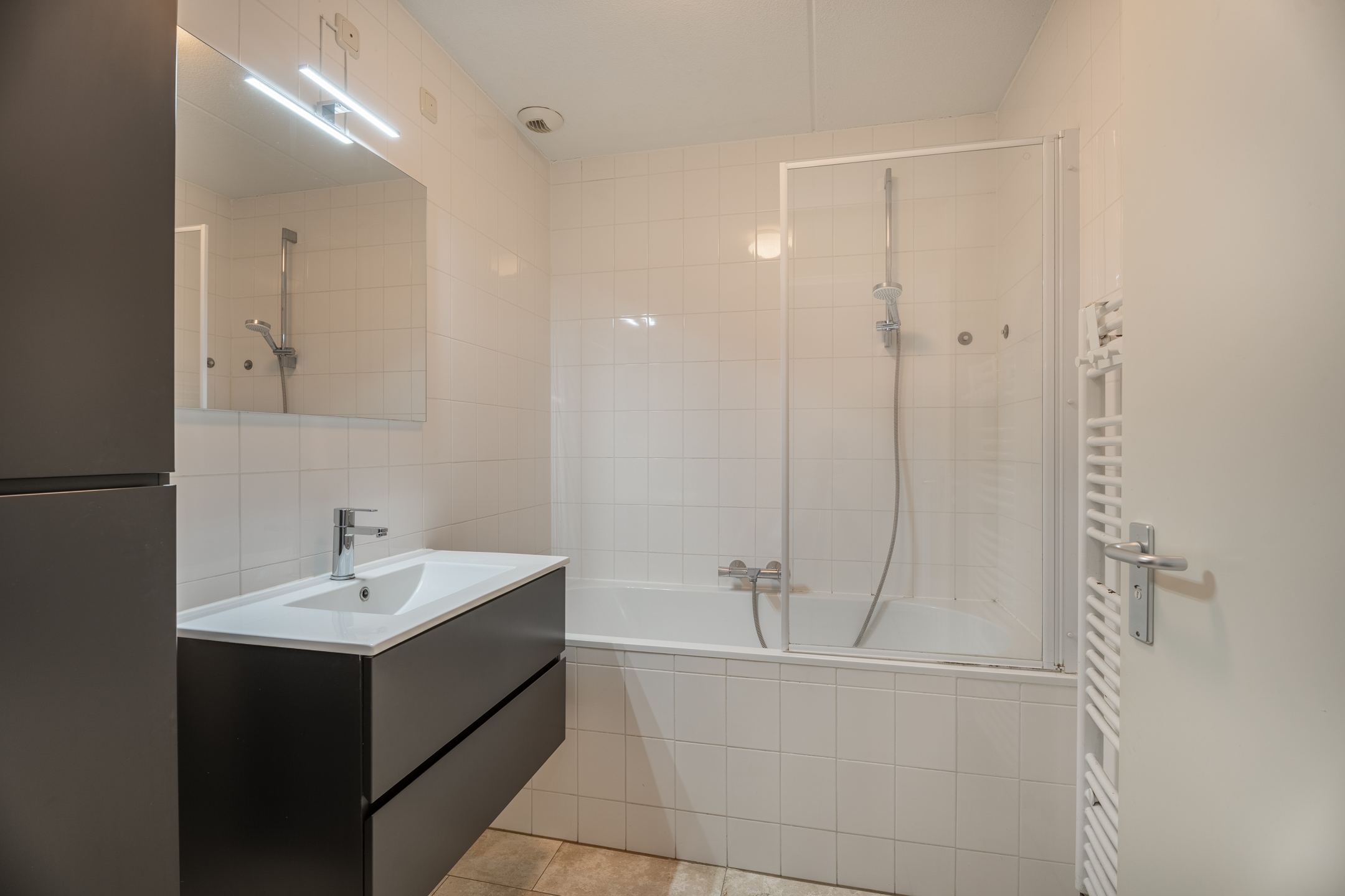 De badkamer is volledig betegeld en praktisch ingericht. Deze is voorzien van een ligbad met douche, een wastafelmeubel met spiegel en een designradiator. De ruimte oogt fris en functioneel.