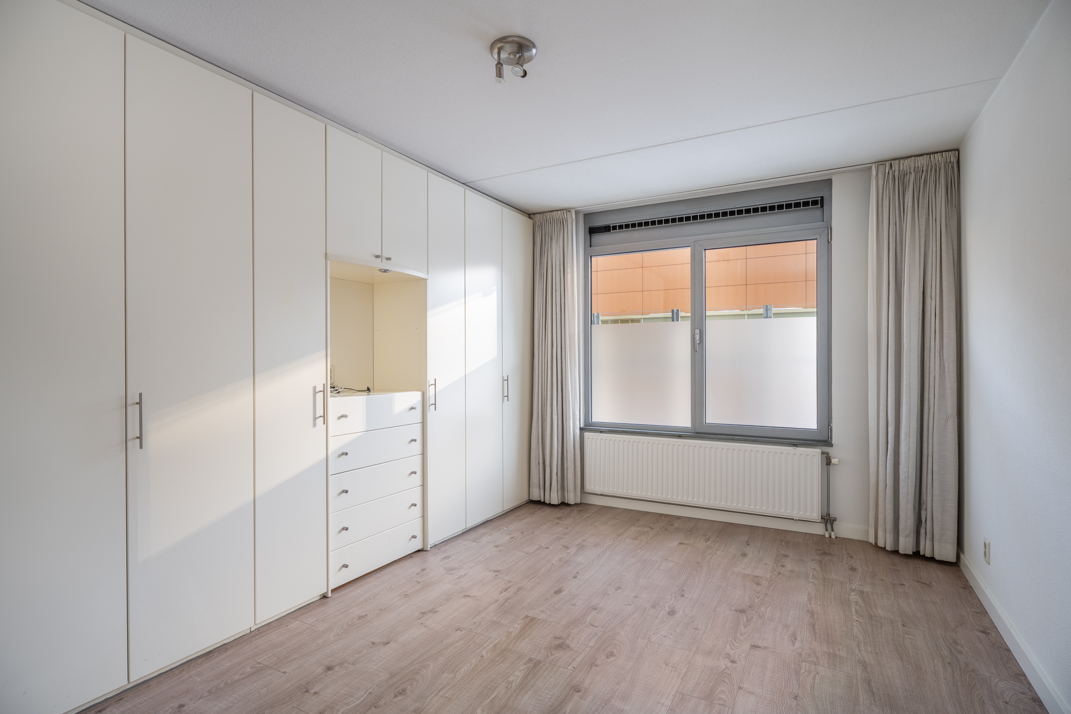 Het appartement beschikt over twee slaapkamers, gelegen aan de achterzijde. De hoofdslaapkamer is ruim bemeten. De kamer is voorzien van een nette vloerafwerking en een groot raam, wat zorgt voor voldoende daglicht. Daarnaast is er een vaste kastenwand aanwezig, ideaal voor extra bergruimte. De tweede slaapkamer is ideaal te gebruiken als logeer-, werk- of hobbykamer.