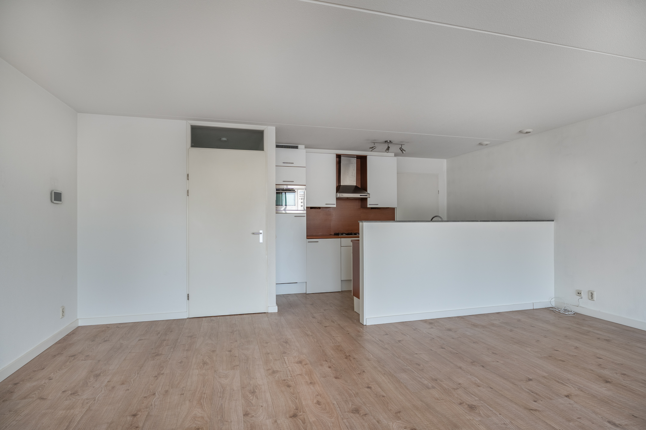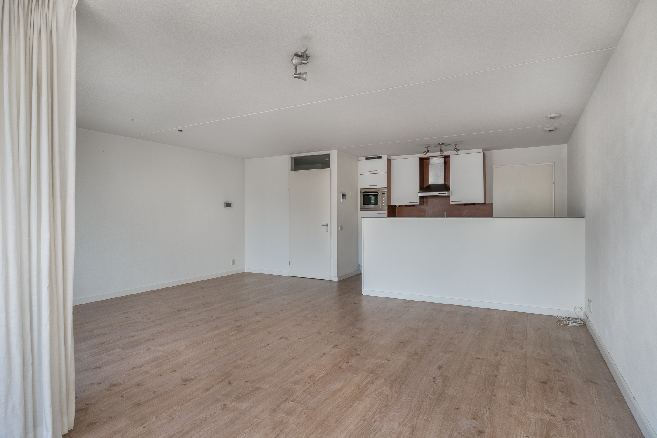 De woonkamer vormt samen met de eethoek en open keuken één royale leefruimte. Dankzij de rechthoekige vorm is de ruimte uitstekend in te delen met zowel een comfortabele zithoek als een volwaardige eettafel. De grote raampartijen zorgen voor een prettige lichtinval en versterken het ruimtelijke gevoel. De neutrale afwerking zorgt ervoor dat de ruimte eenvoudig naar eigen smaak is in te richten. Aansluitend aan de woonkamer bevindt zich het balkon, dat voldoende ruimte biedt voor een zitje. Een fijne plek om buiten te zitten en te genieten van de buitenlucht.