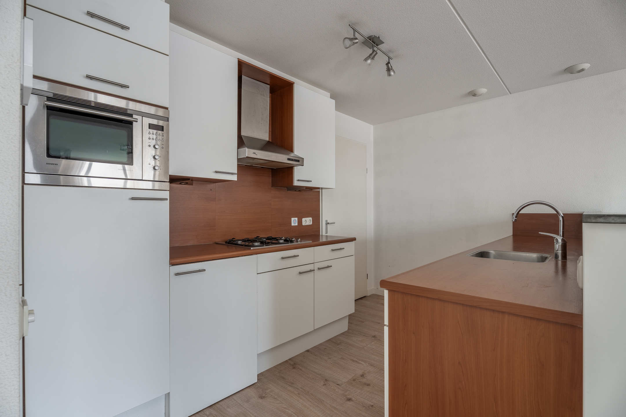 De open keuken sluit direct aan op de woonkamer en is uitgevoerd in een moderne, lichte kleurstelling met een warm houtaccent. De keuken is voorzien van diverse inbouwapparatuur, waaronder een kookplaat, afzuigkap, oven en koelkast. Het praktische keukenblok en het extra werkblad bieden voldoende werk- en opbergruimte.