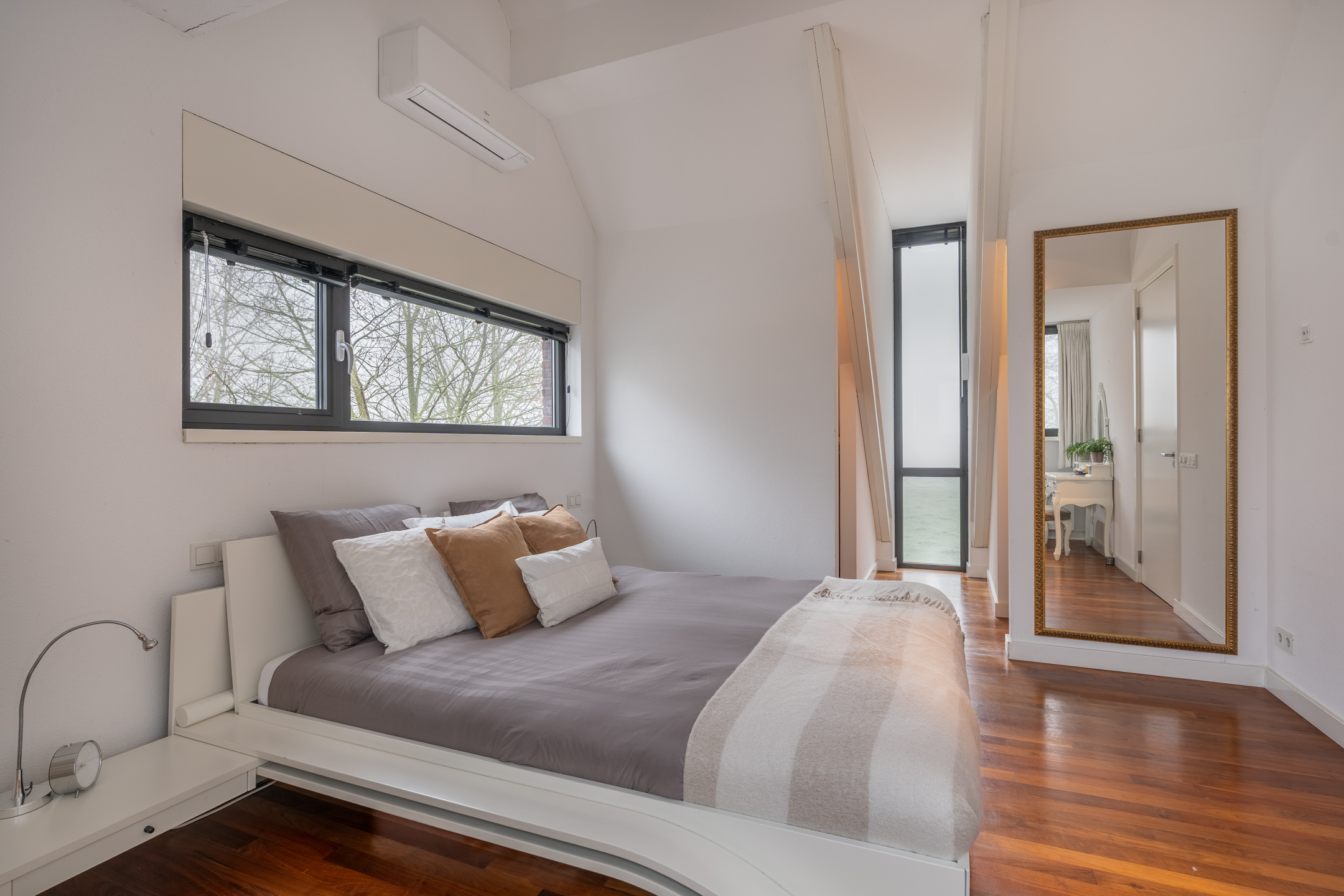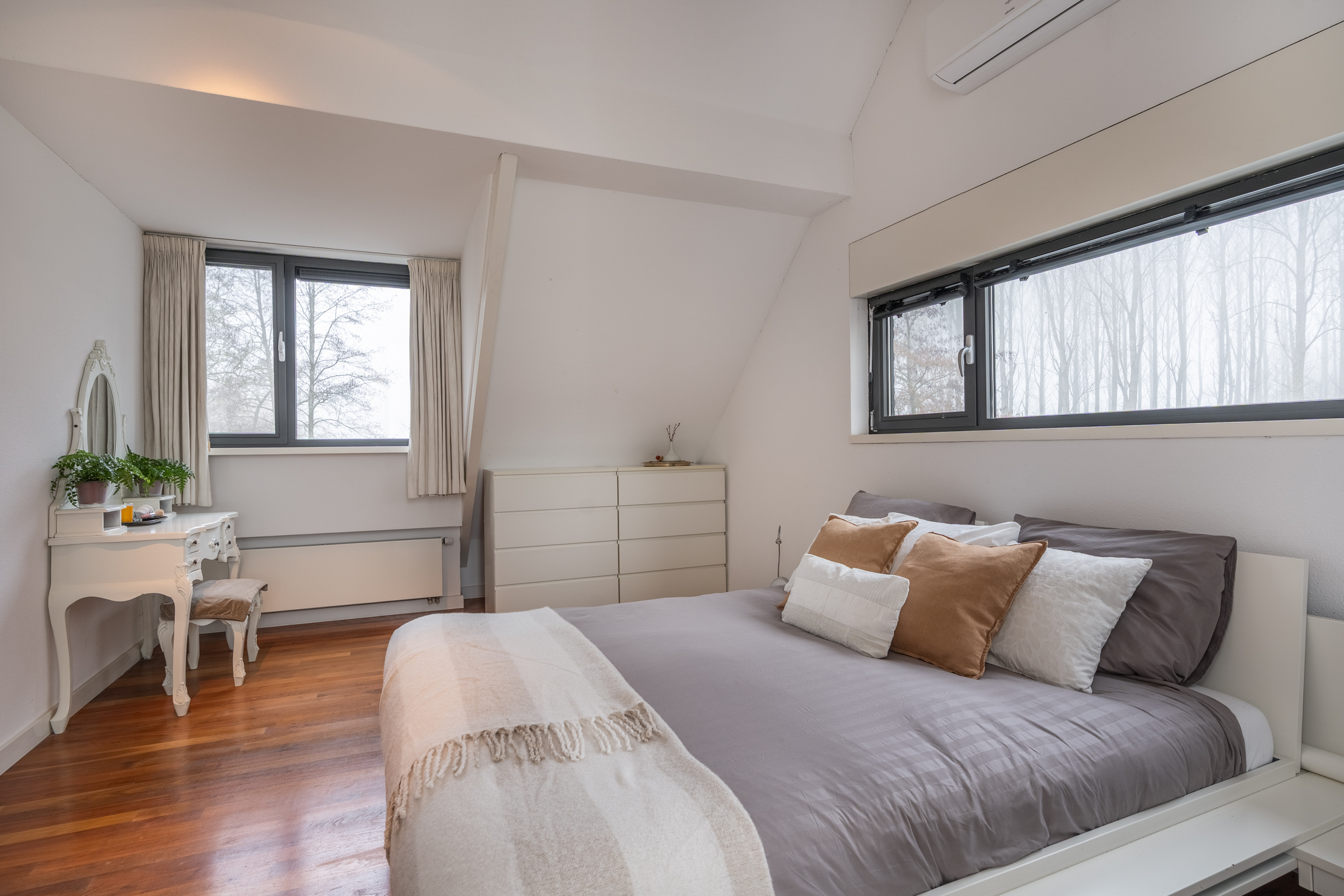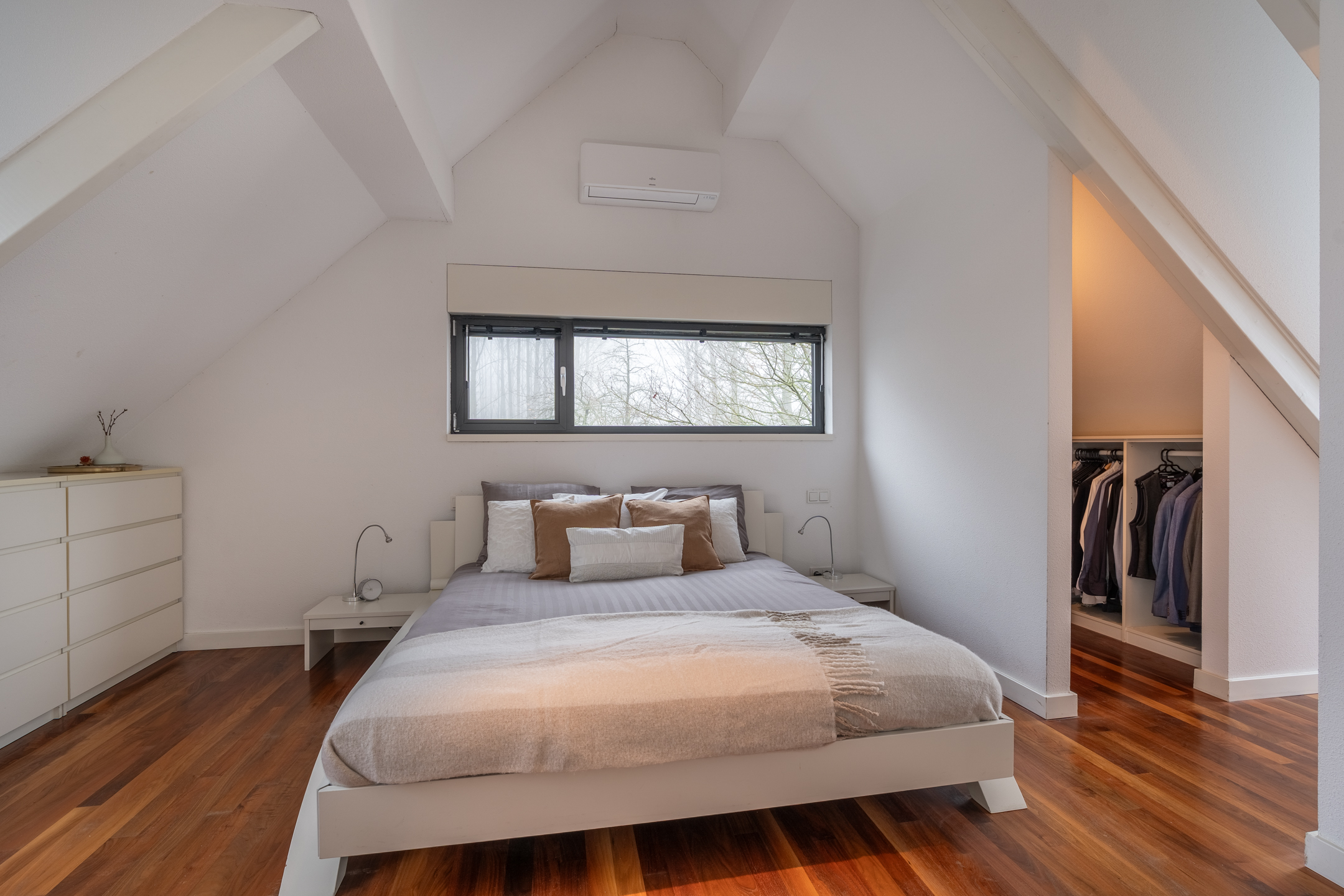 Via een stijlvolle houten trap bereik je de overloop van de eerste verdieping, die toegang biedt tot 4 volwaardige slaapkamers (allen voorzien van hor), een separate toiletruimte en de badkamer. De verdieping is logisch ingedeeld en kenmerkt zich door een prettige maatvoering, veel lichtinval en een hoogwaardige afwerking. De hoofdslaapkamer is royaal van opzet en ingericht met een comfortabele slaapopstelling. De aanwezigheid van ingebouwde kastruimtes onder de schuine kap zorgt voor optimaal gebruik van de ruimte, zonder afbreuk te doen aan de uitstraling. De warme houten vloer draagt bij aan een comfortabele en sfeervolle ambiance. De overige slaapkamers zijn eveneens uitstekend van formaat en flexibel in te richten, bijvoorbeeld als kinder-, logeer- of werkkamer. Ook hier zorgen de ramen en de lichte wandafwerking.