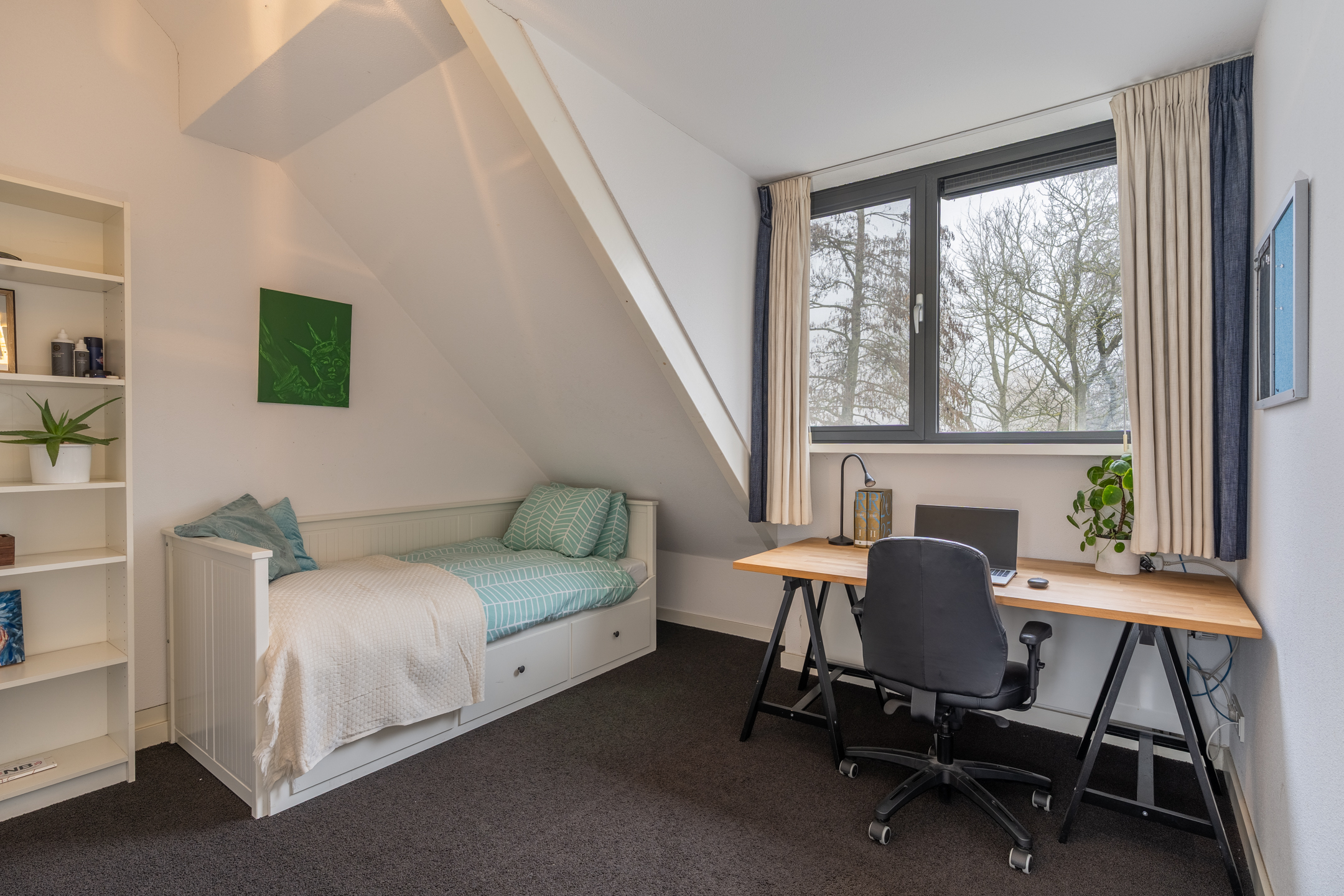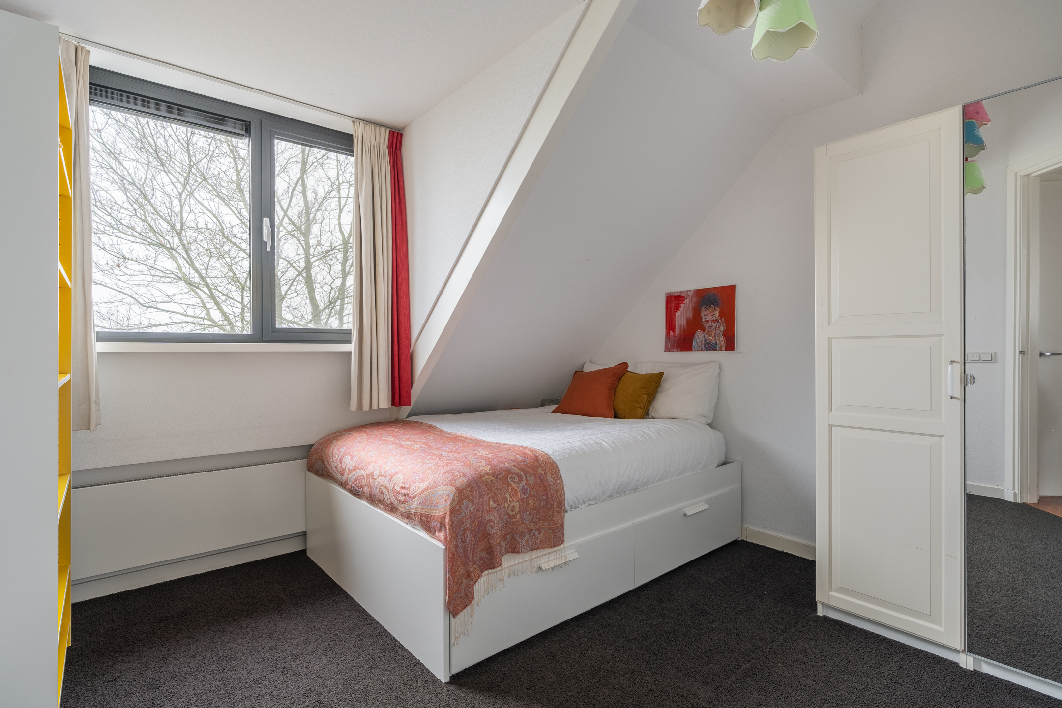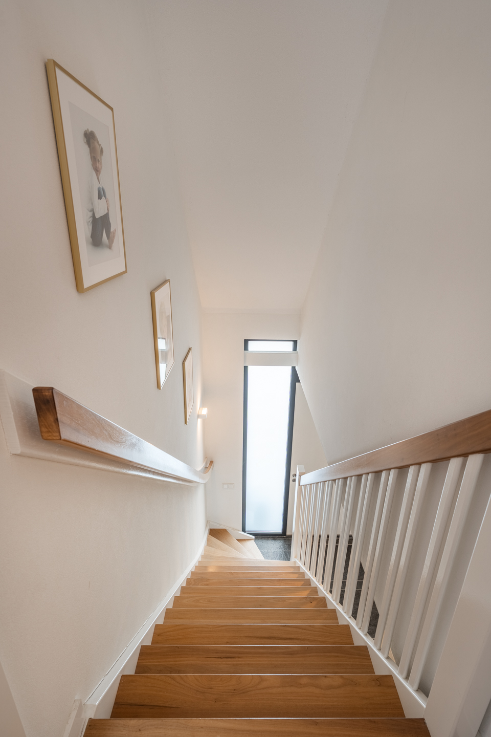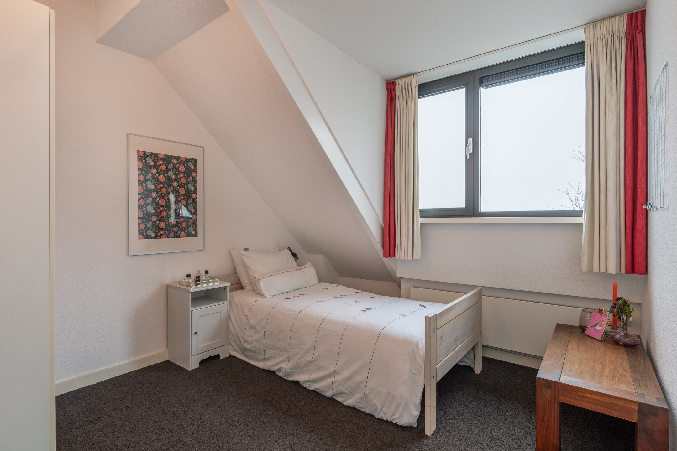 Via een stijlvolle houten trap bereik je de overloop van de eerste verdieping, die toegang biedt tot 4 volwaardige slaapkamers (allen voorzien van hor), een separate toiletruimte en de badkamer. De verdieping is logisch ingedeeld en kenmerkt zich door een prettige maatvoering, veel lichtinval en een hoogwaardige afwerking. De hoofdslaapkamer is royaal van opzet en ingericht met een comfortabele slaapopstelling. De aanwezigheid van ingebouwde kastruimtes onder de schuine kap zorgt voor optimaal gebruik van de ruimte, zonder afbreuk te doen aan de uitstraling. De warme houten vloer draagt bij aan een comfortabele en sfeervolle ambiance. De overige slaapkamers zijn eveneens uitstekend van formaat en flexibel in te richten, bijvoorbeeld als kinder-, logeer- of werkkamer. Ook hier zorgen de ramen en de lichte wandafwerking.
