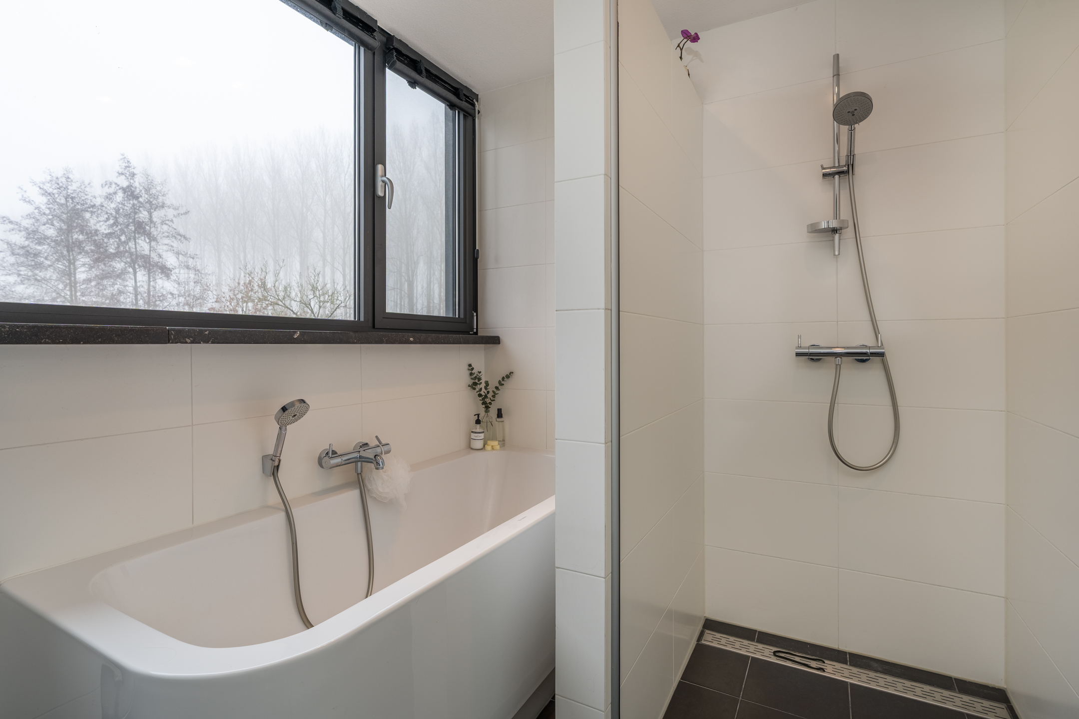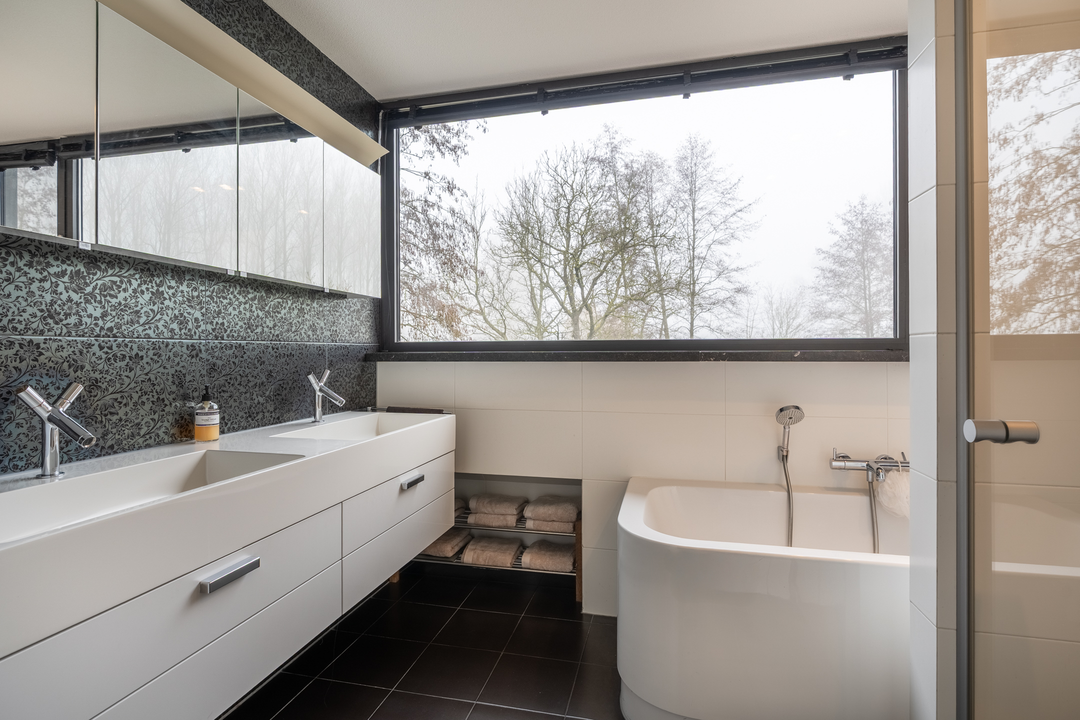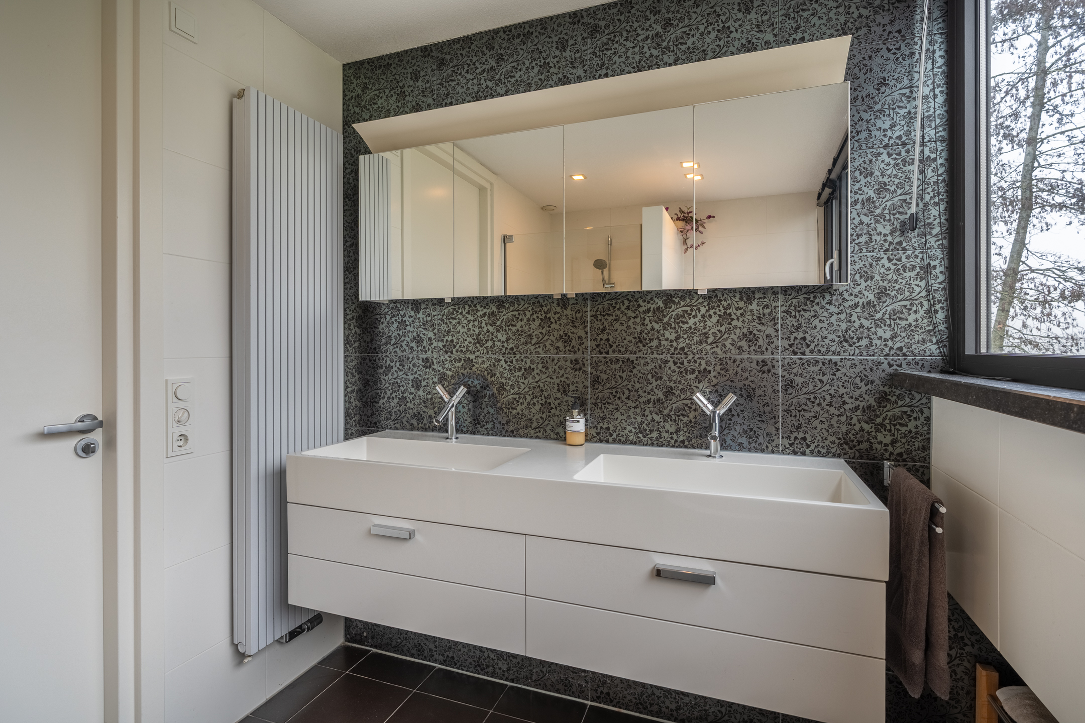 Centraal op de verdieping bevindt zich de badkamer, praktisch gelegen ten opzichte van de slaapkamers. De badkamer is ingericht met een stijlvol dubbel wastafelmeubel met strak vormgegeven kranen en veel bergruimte in de lades. Boven het meubel bevindt zich een brede spiegelwand. De wand achter de wastafels is afgewerkt met een decoratieve tegel met subtiel patroon, wat de ruimte een luxe en eigen karakter geeft. Daarnaast beschikt de badkamer over een vrijstaand ligbad, ideaal voor ontspanning. Het bad is gecombineerd met een moderne wandkraan en handdouche en is geplaatst naast het raam, waardoor baden hier een bijzonder prettige beleving wordt. De separate inloopdouche met glazen wand is ruim en praktisch ingericht en sluit perfect aan bij het moderne ontwerp.