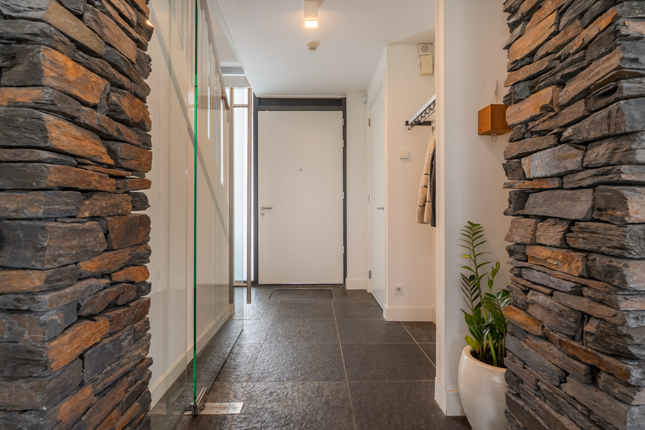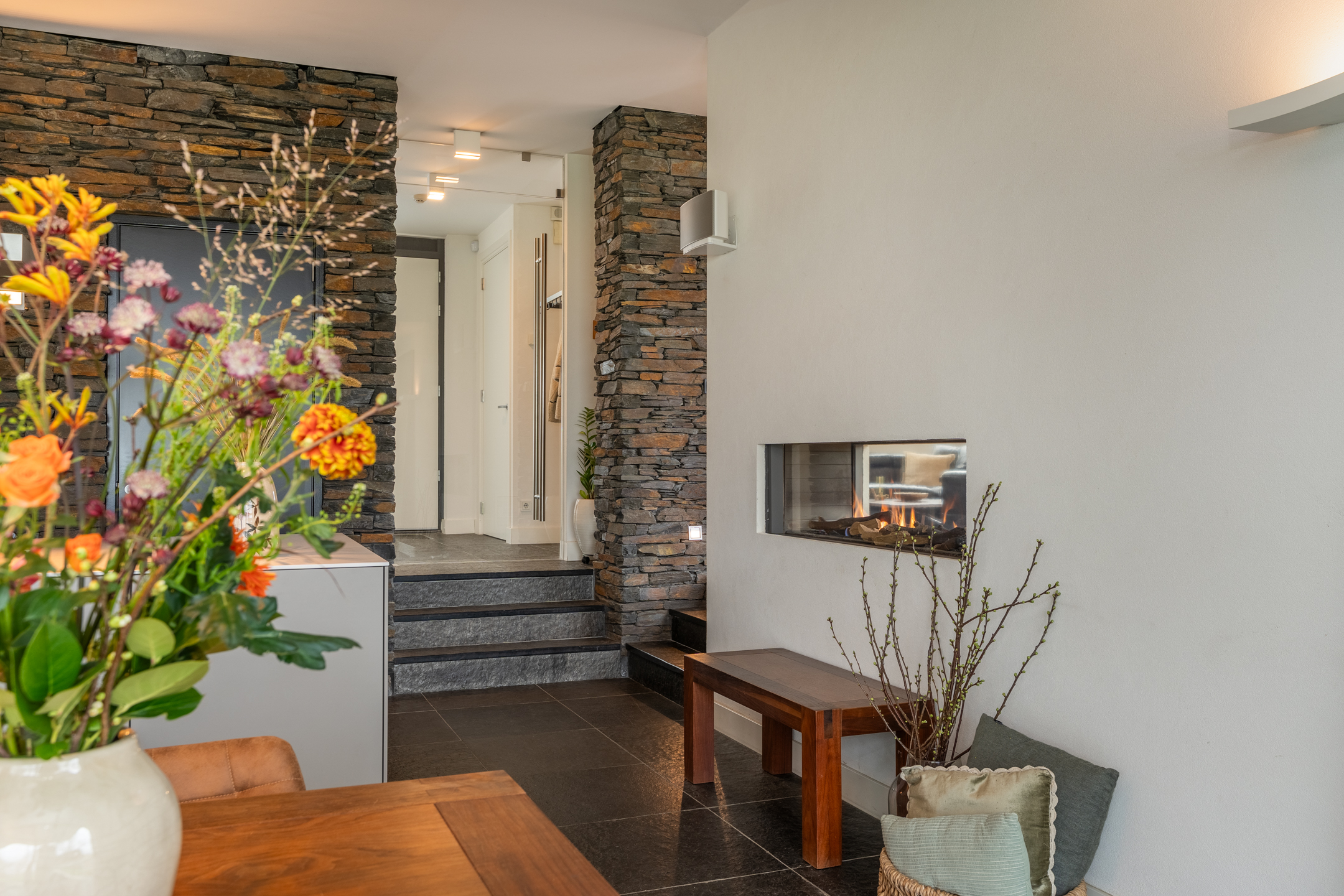 Via de entree betreed je de woning en kom je in een nette hal met toegang tot de meterkast, de trapopgang en de leefruimtes. De hal geeft direct de uitstraling van de woning weer: modern, strak, duurzaam en zeer onderhoudsvriendelijk. De combinatie van een donkere natuurstenen vloer (Noorse lei) met prachtige natuurstenen wanden in een antracietgrijze kleur, met warm bruin, oranje accenten zorgen voor een luxe en tijdloze sfeer. Een stijlvolle binnenkomst die meteen laat zien dat aan kwaliteit en afwerking veel aandacht is besteed. Vanuit de hal ontvouwt zich een verrassend speelse, en doordacht ingedeelde begane grond.