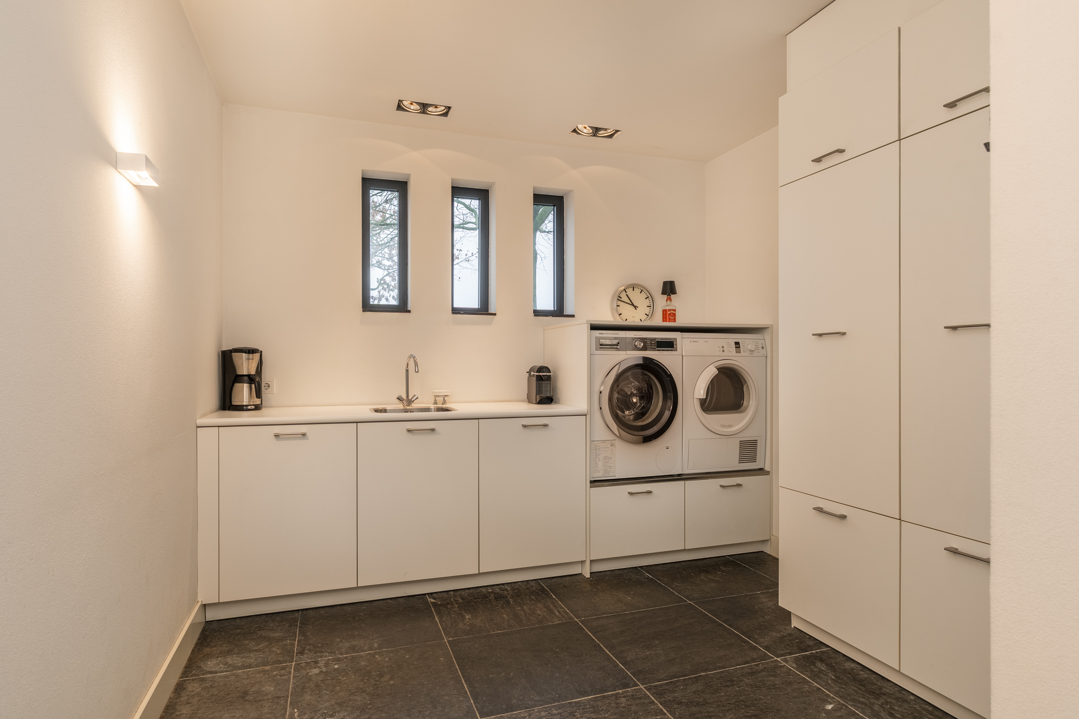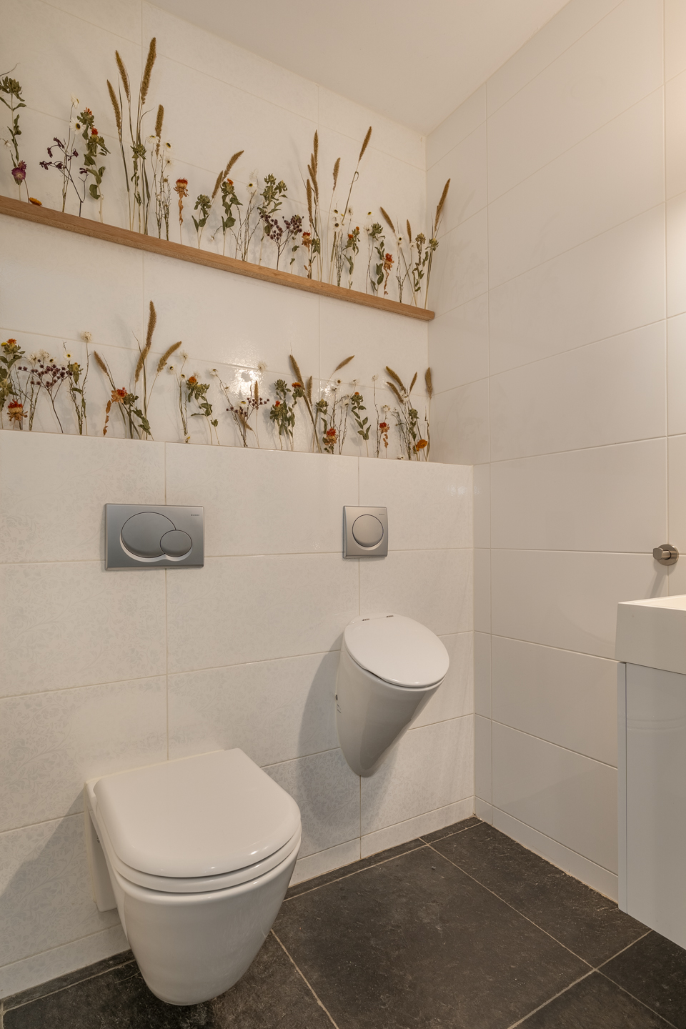 Vanuit de leefruimte is er toegang tot een aparte hal, waarin zowel het toilet als de bijkeuken zijn gevestigd. Het toilet is modern en verzorgd uitgevoerd, met als extra gemak voor de heren een urinoir. De ruimte is voorzien van een wandcloset en een fontein, met als bijzonder detail is de decoratieve nis met houten plank. Aansluitend bevindt zich de ruime bijkeuken, een zeer praktische ruimte die voorziet in alle gemakken. De bijkeuken is ingericht met een op maat gemaakte kastenwand, waardoor er volop bergruimte is. Daarnaast zijn hier de aansluitingen voor wasmachine en droger netjes geïntegreerd. Een werkblad met spoelbak maakt de ruimte extra functioneel, ideaal voor huishoudelijke werkzaamheden. De technische installaties zoals CV, hybridewarmtepomp en mechanische ventilatie bevinden zich hier ook.