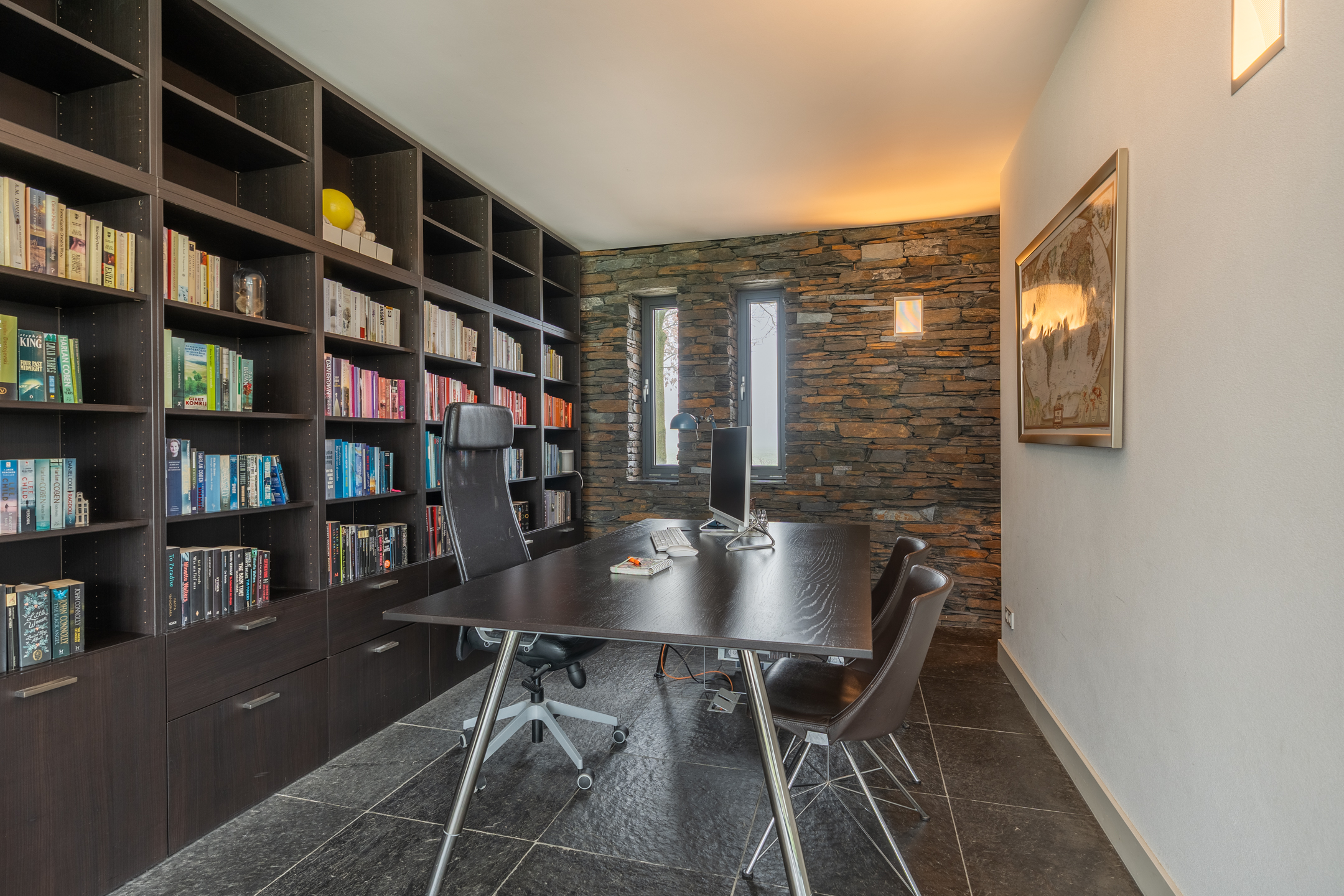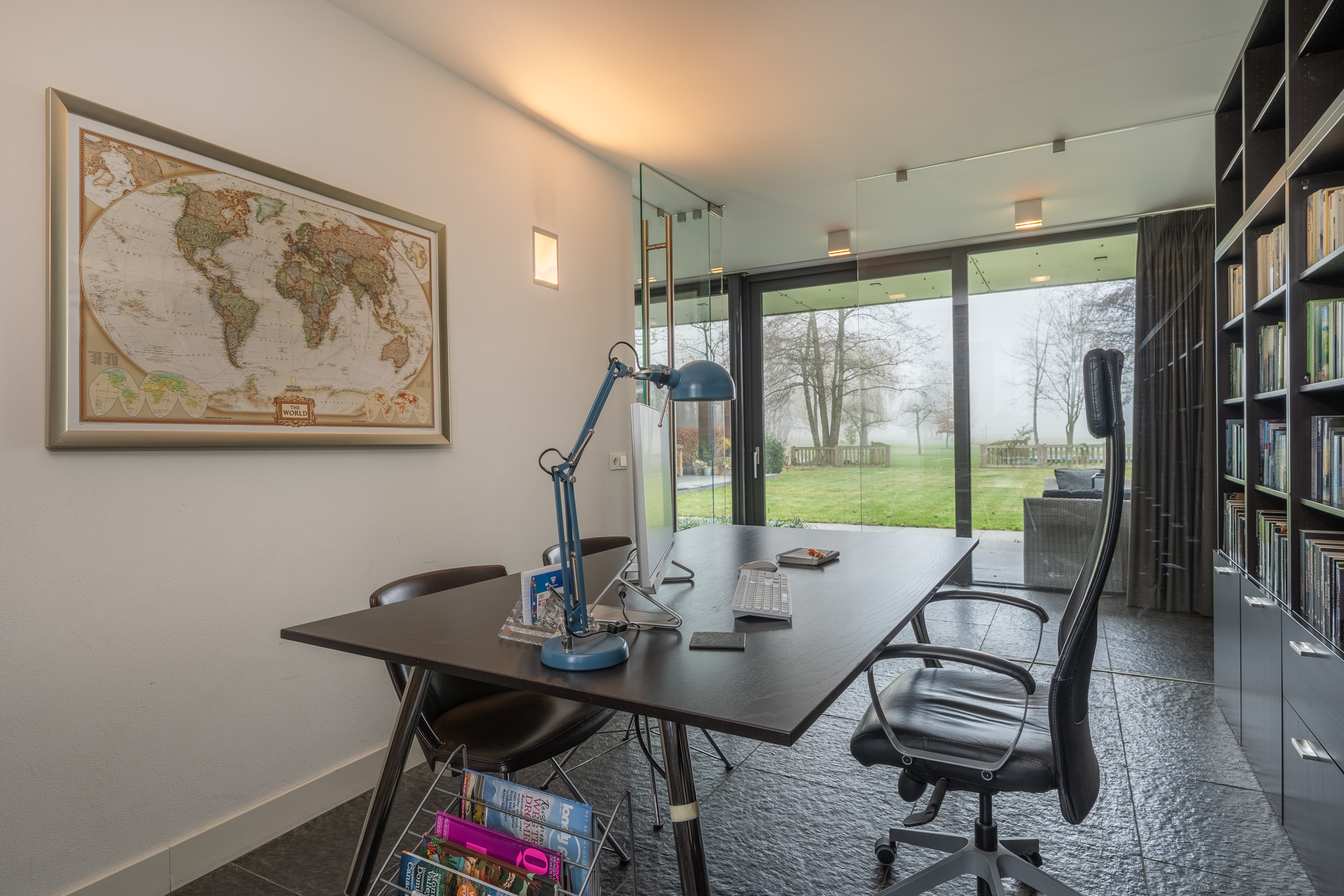 Direct rechts van de keuken bevindt zich een fraai ingerichte kantoor- of werkruimte, ideaal voor thuiswerken of studeren. De ruimte is afsluitbaar door middel van een strakke glazen wand met glazen deur. Langs één zijde is een kastenwand met geïntegreerde boekenkasten gerealiseerd, die niet alleen veel bergruimte biedt maar ook bijdraagt aan de rustige en verzorgde uitstraling van de ruimte.