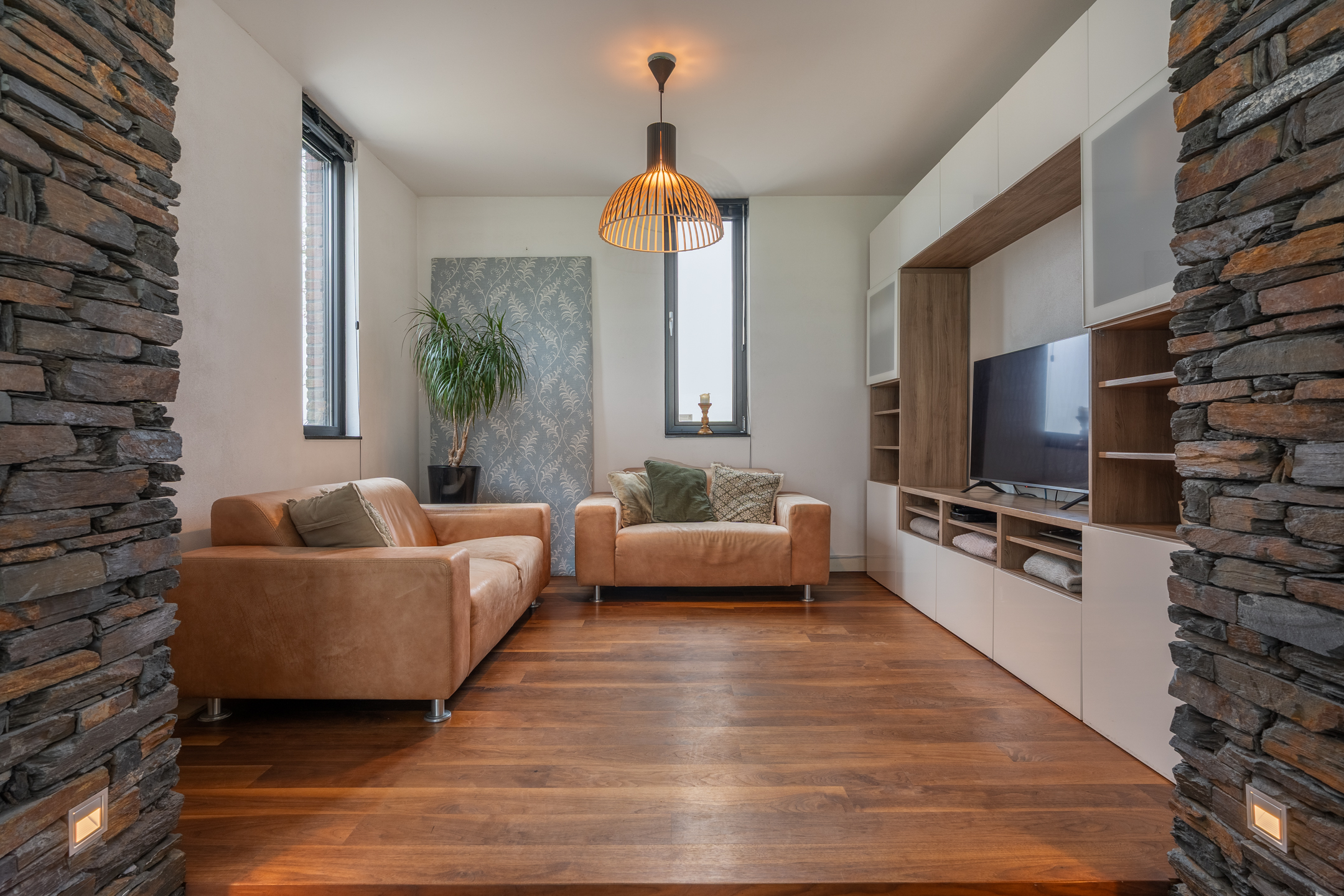 Direct rechts naast de hal, aan de voorzijde van de woning, bevindt zich de televisiekamer middels een speelse verhoging bereikbaar: een afzonderlijke en sfeervolle ruimte die bewust losstaat van de centrale leefruimtes. Deze kamer is ideaal ingericht als plek om te ontspannen, u ervaart een prettige lichtinval en hoge mate van privacy. De kastenwand met geïntegreerd tv-meubel komt hier goed tot zijn recht en biedt niet alleen een strakke en opgeruimde uitstraling, maar ook volop praktische bergruimte. Hierdoor blijft de kamer overzichtelijk en functioneel, zonder concessies te doen aan comfort of esthetiek. Ook als speelkamer, chillruimte voor tieners of zelfs als extra lounge-/muziekkamer zou deze ruimte prima tot zijn recht komen. De warme noten houten vloer welke tevens in de woonkamer ligt maakt het geheel af.