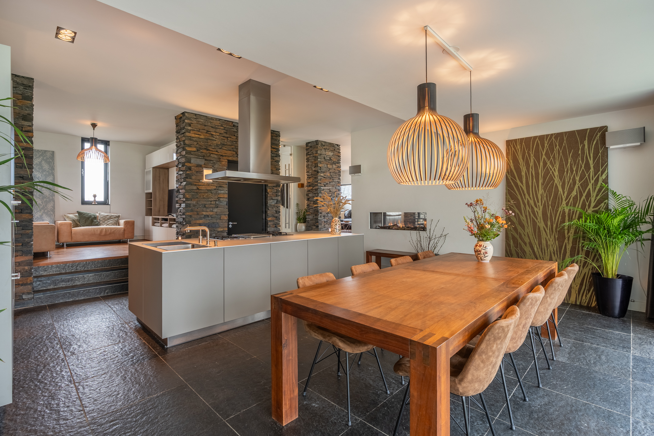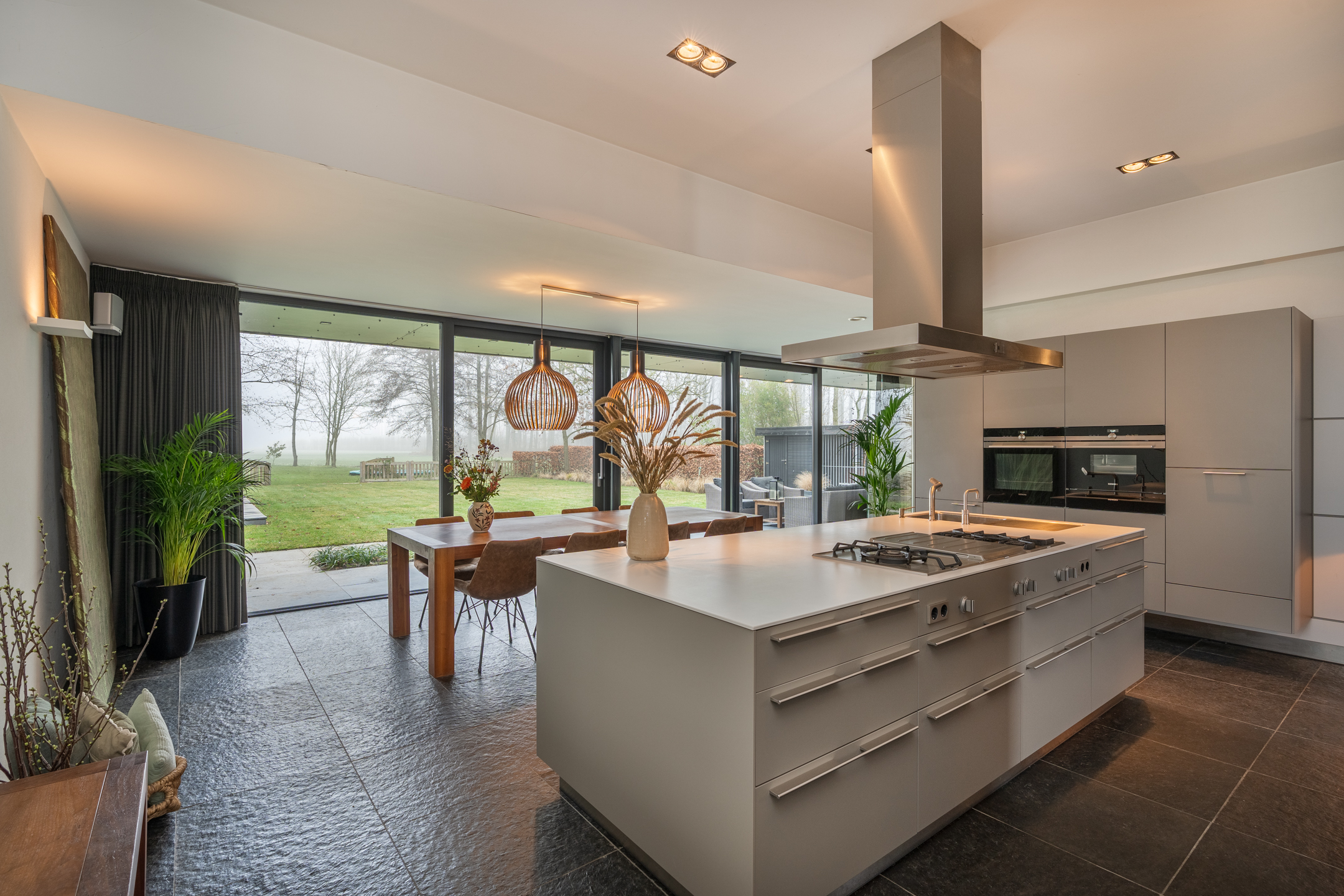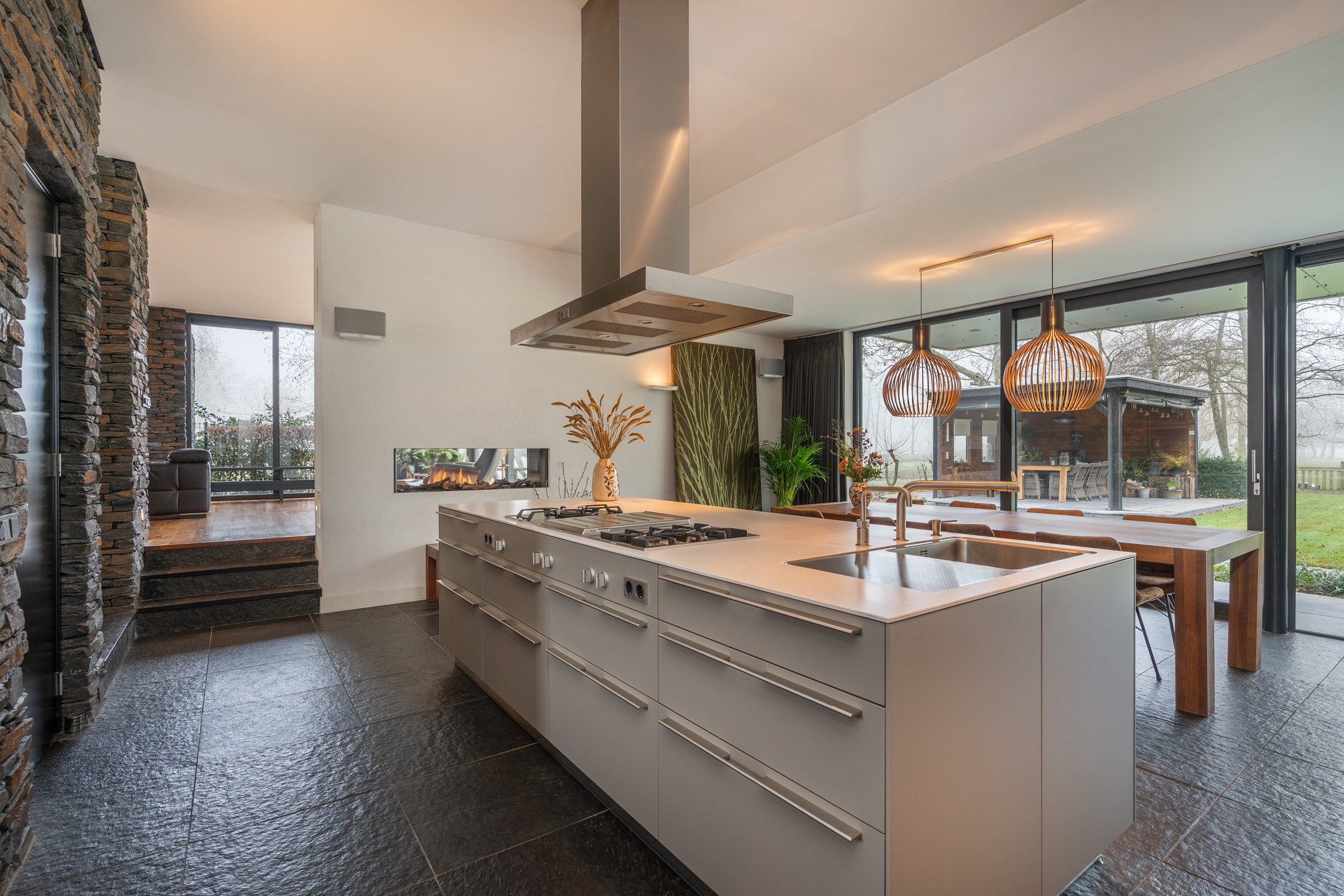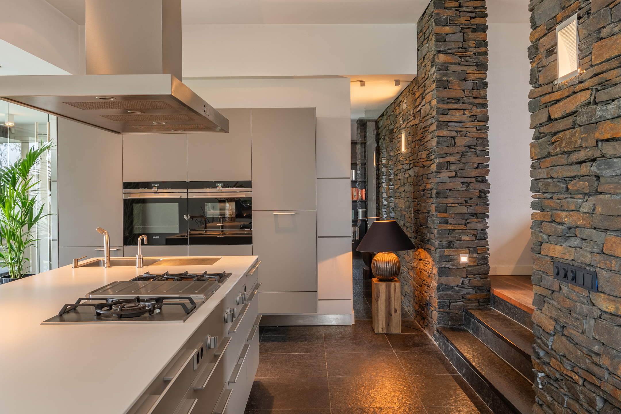 De woning beschikt over een hoogwaardige, moderne leefkeuken (Bulthaup) met een strak en tijdloos ontwerp. De keuken ligt lager dan de hal en de woonkamer, een trap met drie treden zorgt op een speelse manier voor toegang tot de ruimtes. Wat opvalt is dat de keuken is uitgevoerd in een lichte, kastafwerking en vormt een fraai contrast met de donkere natuurstenen vloer. Centraal in de ruimte bevindt zich een royaal kookeiland, dat niet alleen veel werk- en bergruimte biedt, maar ook fungeert als sociale ontmoetingsplek. Het eiland is voorzien van een ingebouwde gaskookplaat, een spoelbak met designkraan, inbouwoven, stoomoven met aparte warmhoudlade, inbouwkoelkast, inbouwvaatwasser en een RVS afzuigkap, stijlvol geïntegreerd boven het kookeiland. Tussen de woonkamer en de leefkeuken bevindt zich een stijlvolle, moderne gashaard, die aan beide zijden zichtbaar is. De haard is strak geïntegreerd in de wand en zorgt voor extra sfeer, warmte en comfort, zowel vanuit de zithoek als vanuit de keuken en eethoek. Dankzij de open verbinding met de eethoek en de grote glazen raampartijen met 2 schuifpuien aan de tuinzijde is dit een ruimtelijke keuken, ideaal voor zowel dagelijks gebruik als uitgebreid koken en tafelen met gasten. Vanuit de keuken is er directe toegang tot de grote afgewerkte kelder van ca 22 m2.