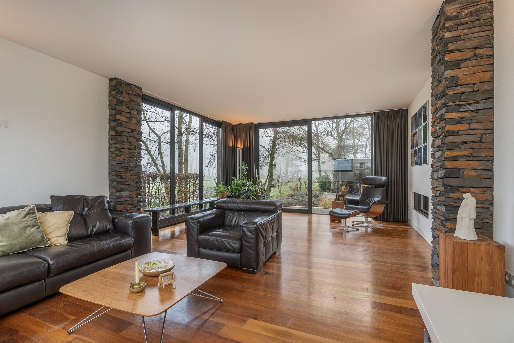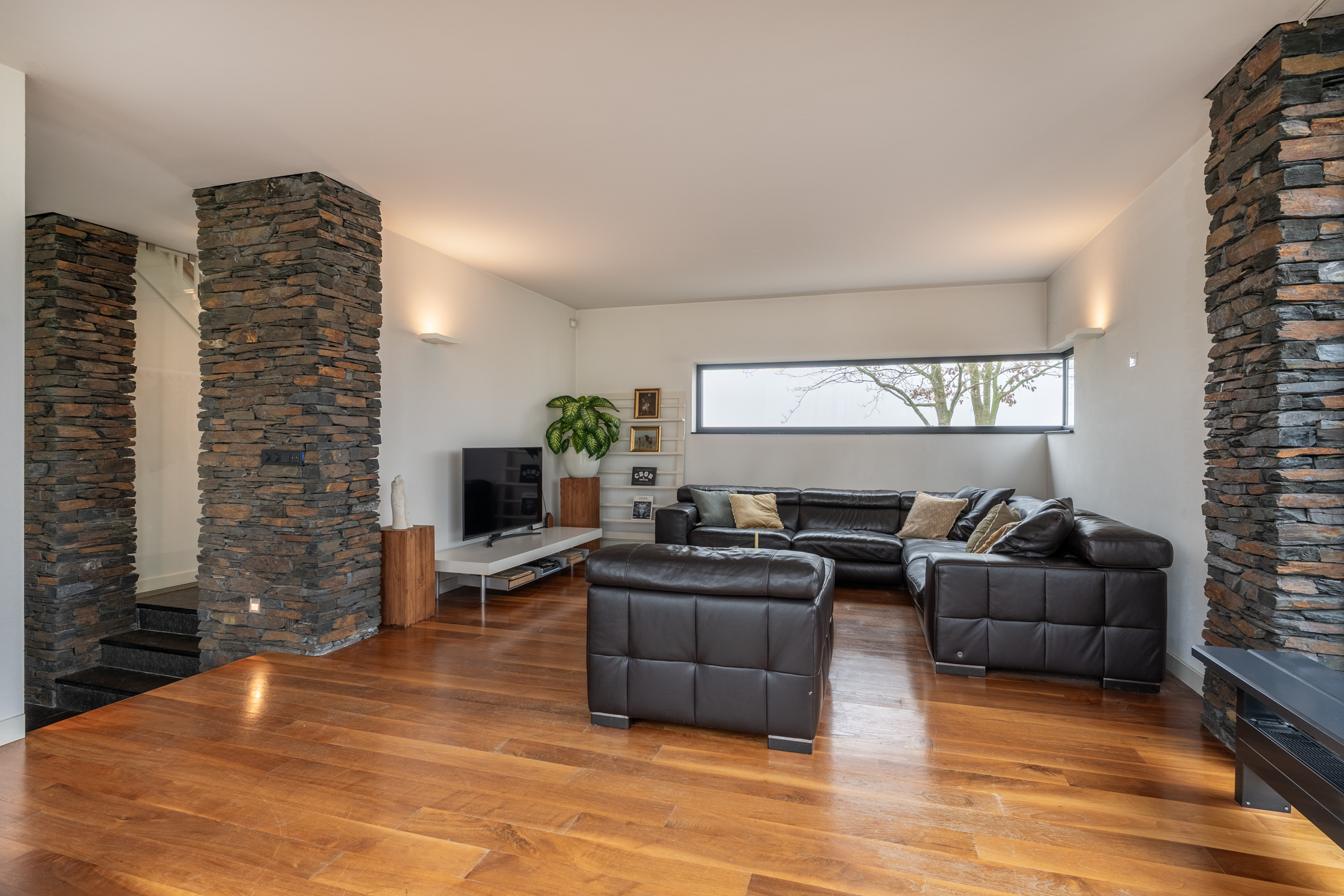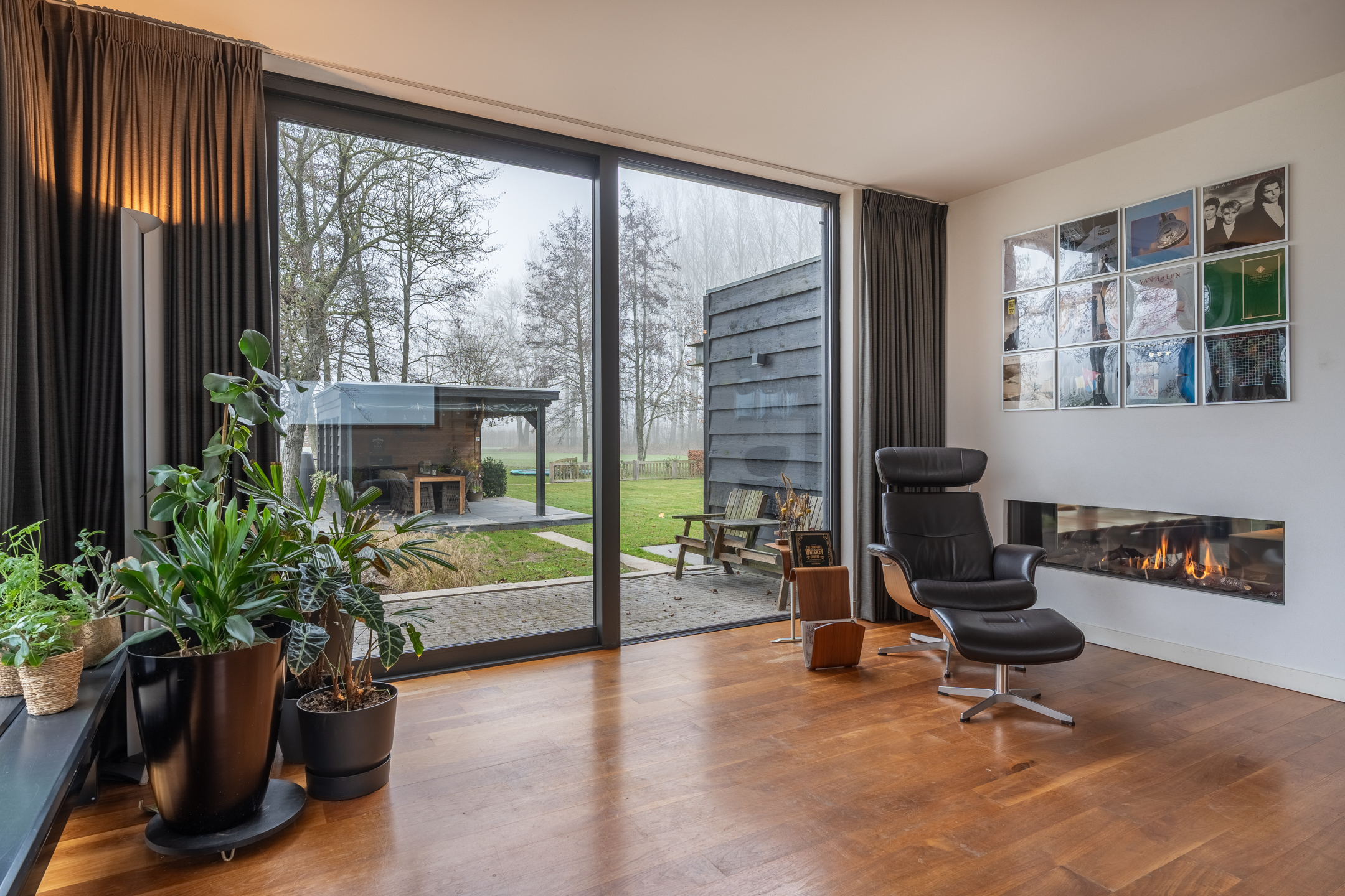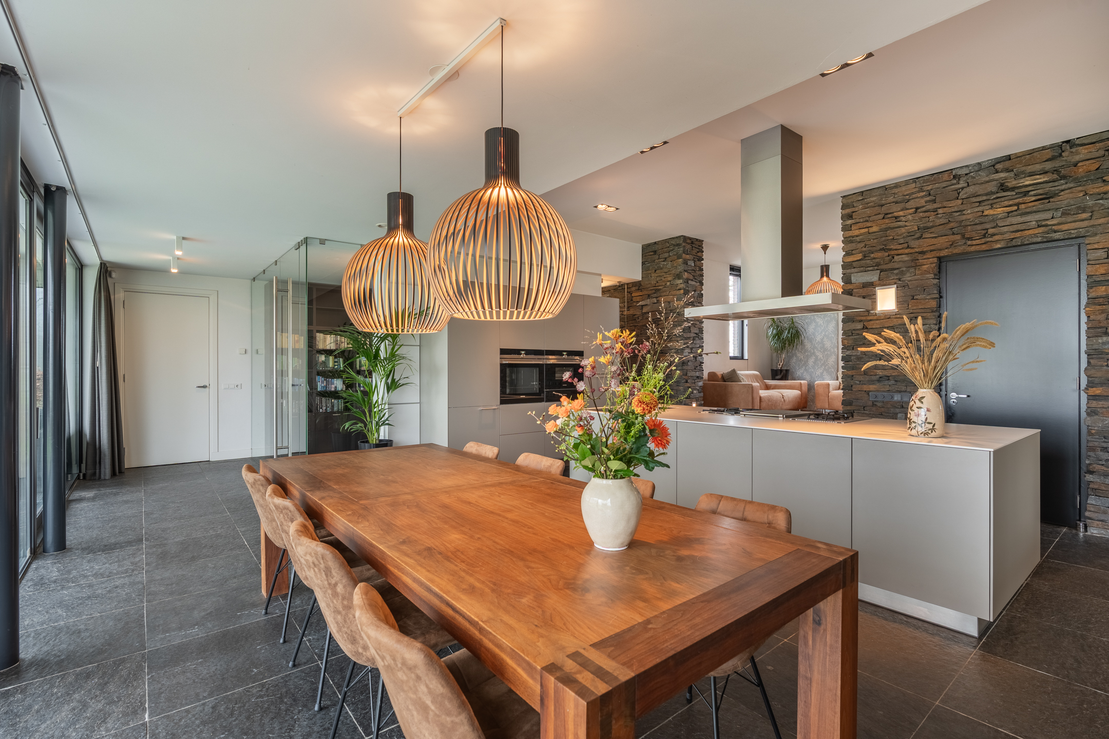 De woonkamer is links aan de voorzijde van de woning gesitueerd en kenmerkt zich door een ruimtelijke en rustige opzet. Dankzij de slimme indeling is er volop plaats voor een royale zithoek. De ruimte is afgewerkt met een topkwaliteit houten noten vloer, die zorgt voor een warme en luxe uitstraling en mooi contrasteert met de strakke architectuur van de woning. Een bijzonder element is het lange, horizontale raam, dat zorgt voor een aangename lichtinval. De achterzijde van het woongedeelte beschikt over grote raampartijen met vloerhoge beglazing voorzien van een derde schuifpui, die zorgen voor een overvloed aan natuurlijk licht en een prachtige verbinding met de tuin en het omliggende groen. De combinatie van natuurlijke materialen, rustige kleuren en doordachte verlichting maakt de woonkamer tot een comfortabele leefruimte.