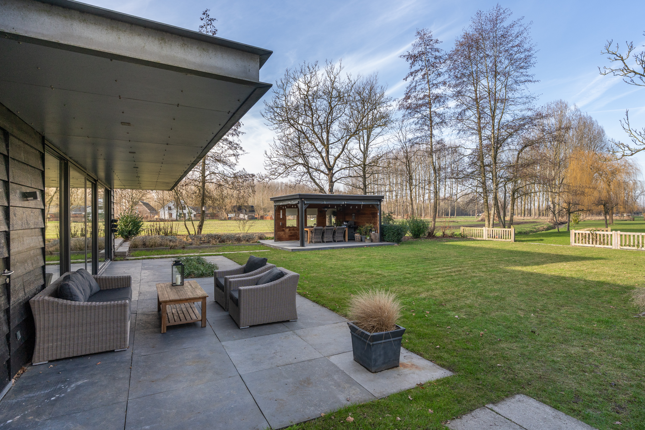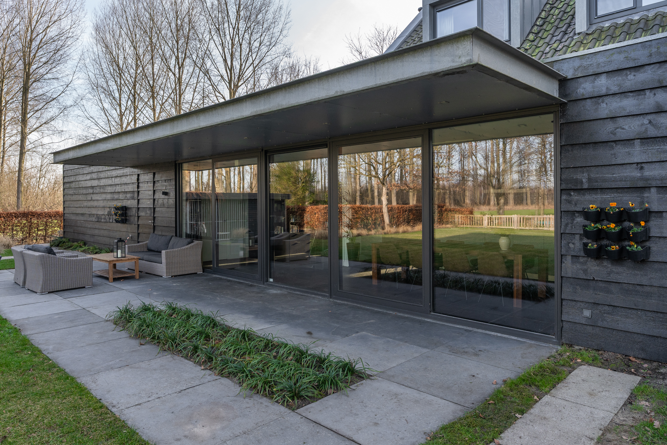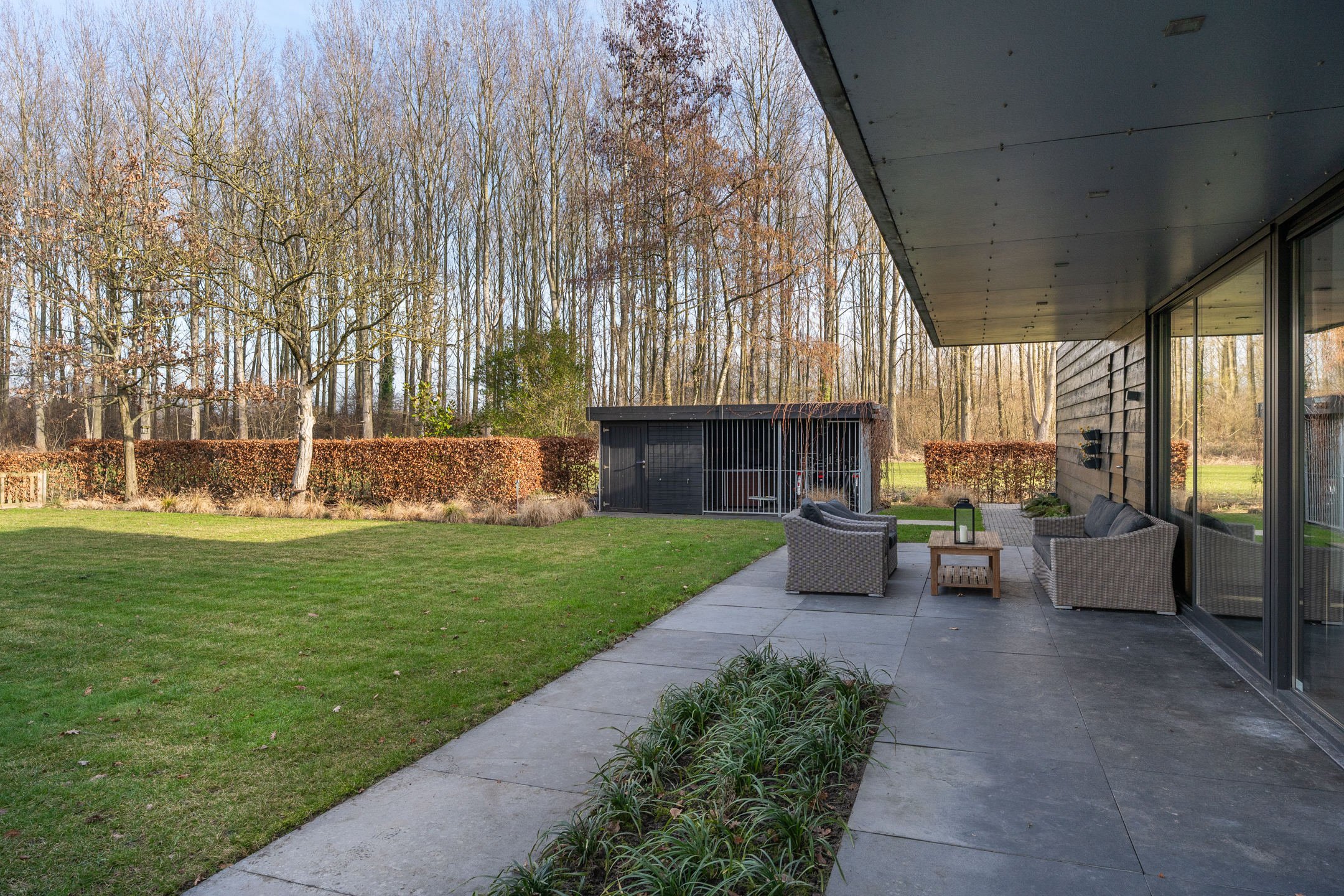 Direct aansluitend aan de leefkeuken bevindt zich de royale overkapping, een heerlijke plek waarbinnen en buiten naadloos in elkaar overlopen. Dankzij de beschutte ligging is dit een plek waar u vrijwel het hele jaar door kunt genieten van het buitenleven, ongeacht het weer. De solide constructie, vaste verlichting en beschutting maken deze ruimte uitermate geschikt voor lange avonden met familie en vrienden, buiten eten of ontspannen in alle rust.